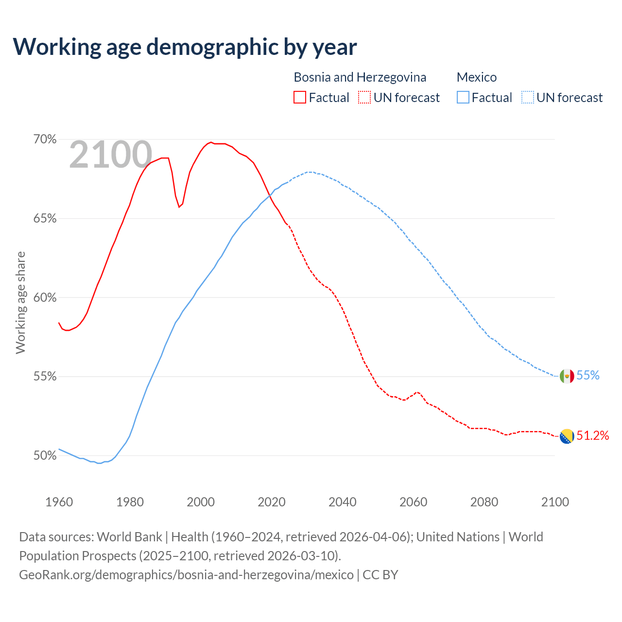- Bosnia and Herzegovina has 2.02M working age adults (aged 15-64) vs 89.6M in Mexico.