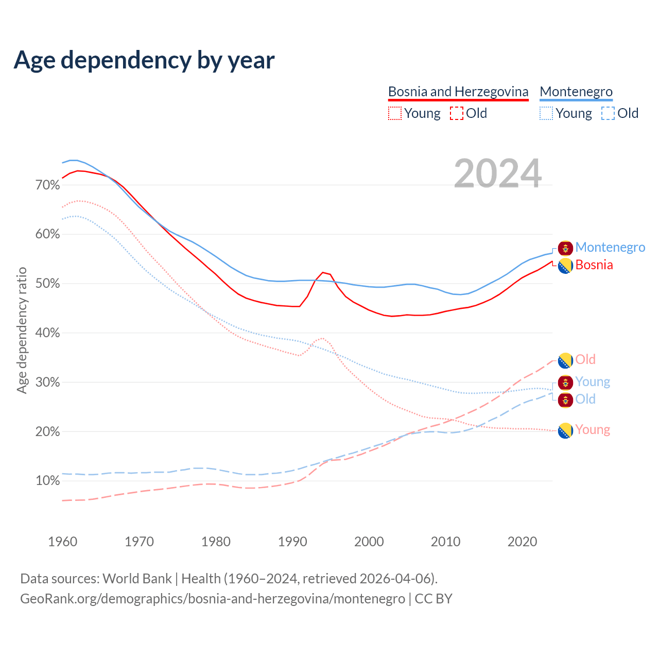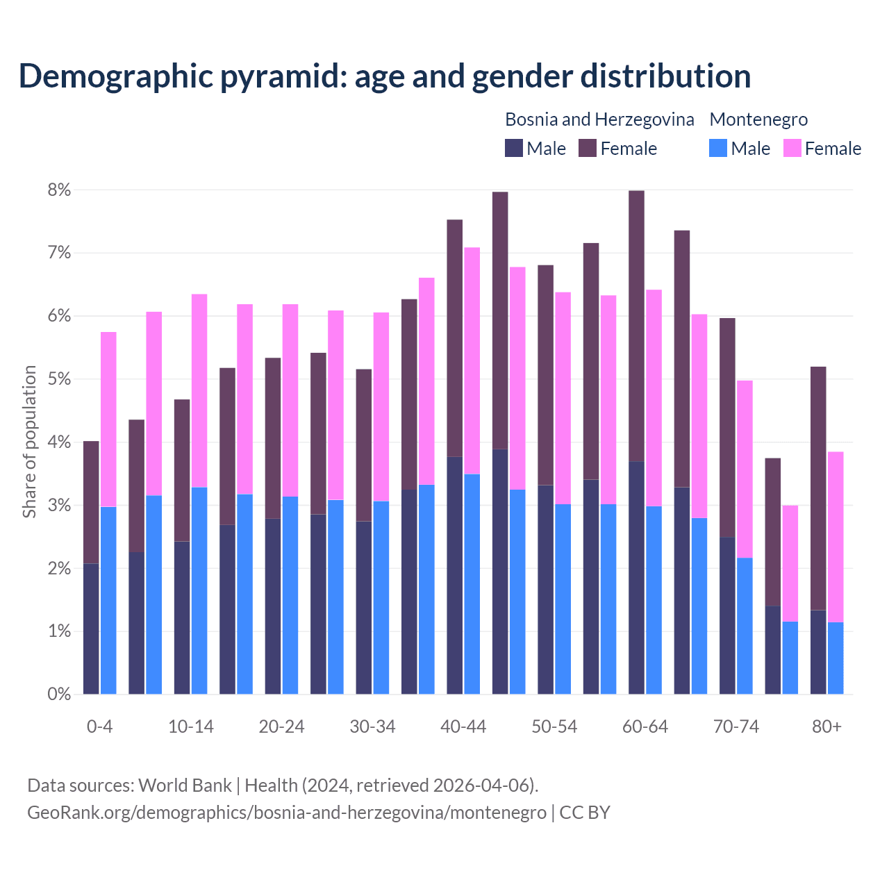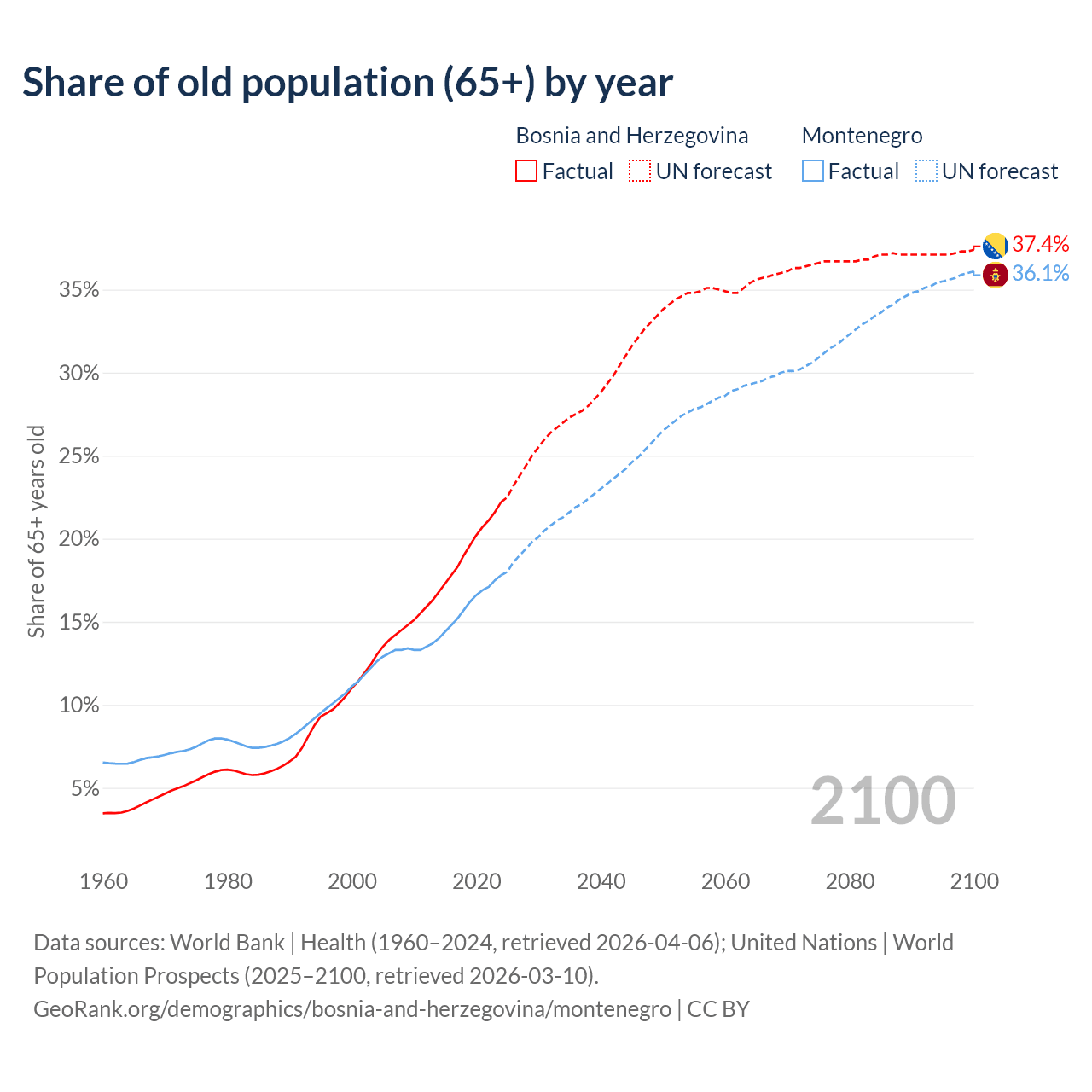 The share of older people aged 65 and over is 22.2% in Bosnia and Herzegovina and 17.8% in Montenegro. Life expectancy in Bosnia and Herzegovina compared to Montenegro .