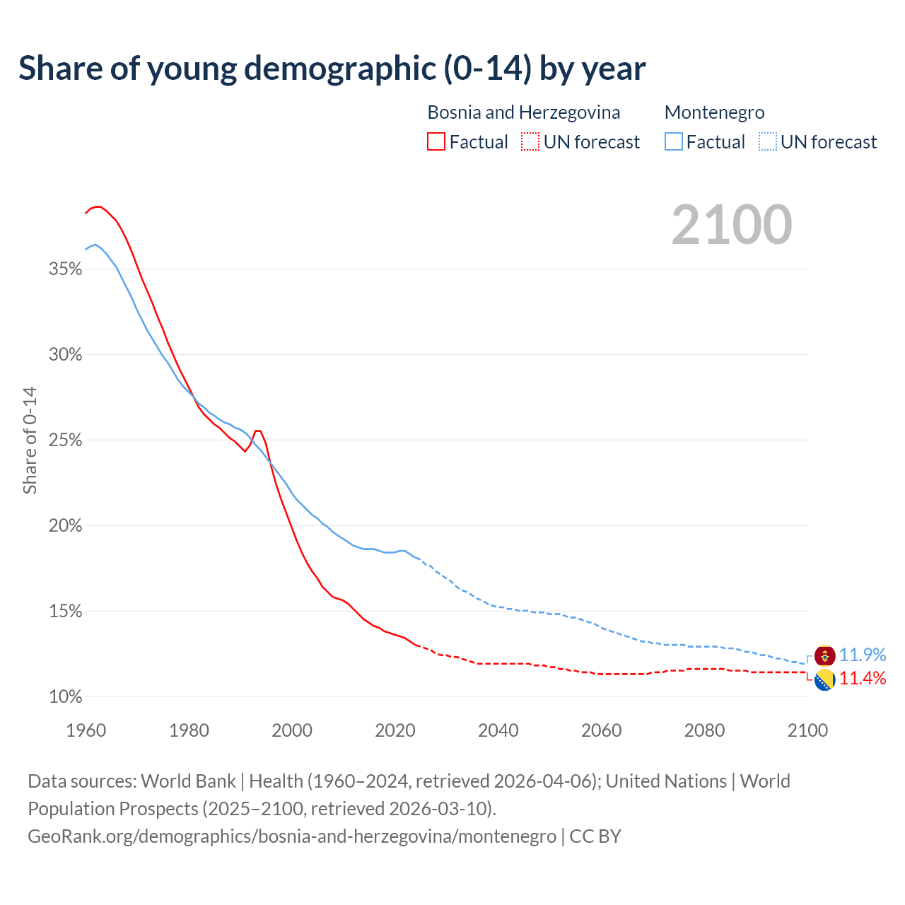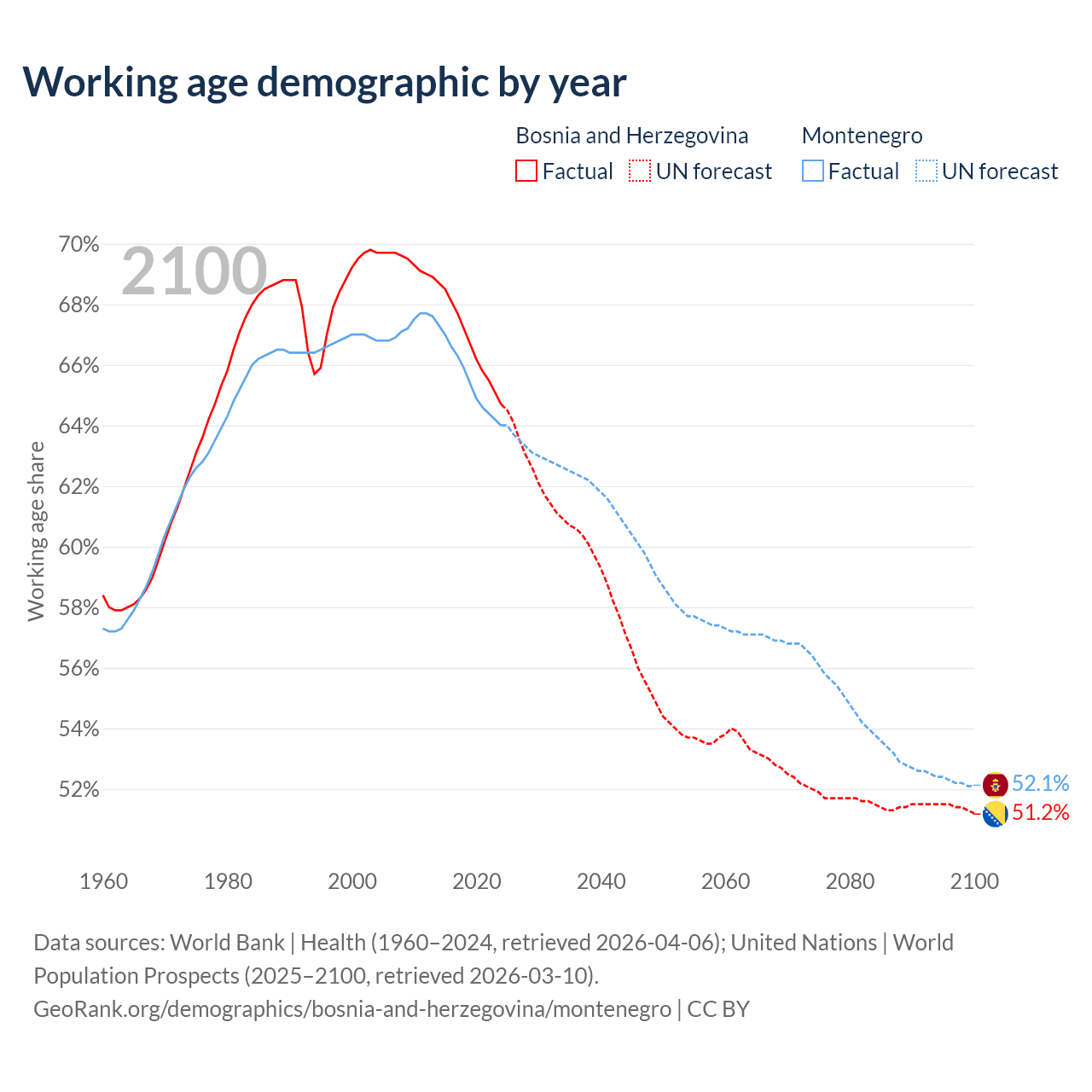Median age Bosnia and Herzegovina vs Montenegro, 1960-2100