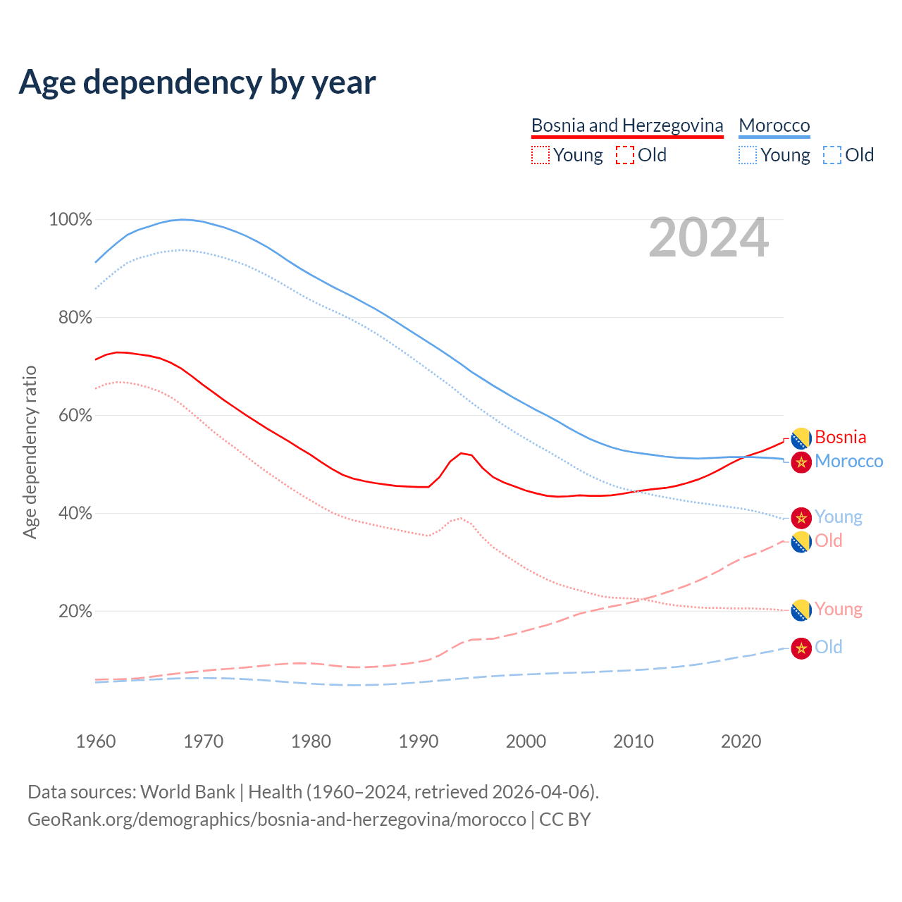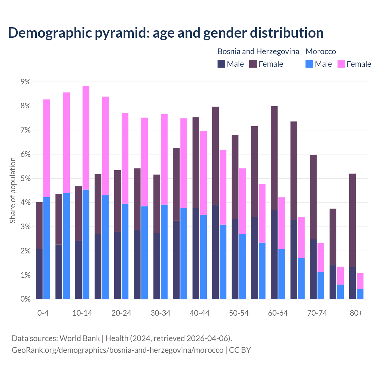 - Bosnia and Herzegovina is ranked 8/196 by median age (oldest to youngest) vs 100/196 for Morocco.