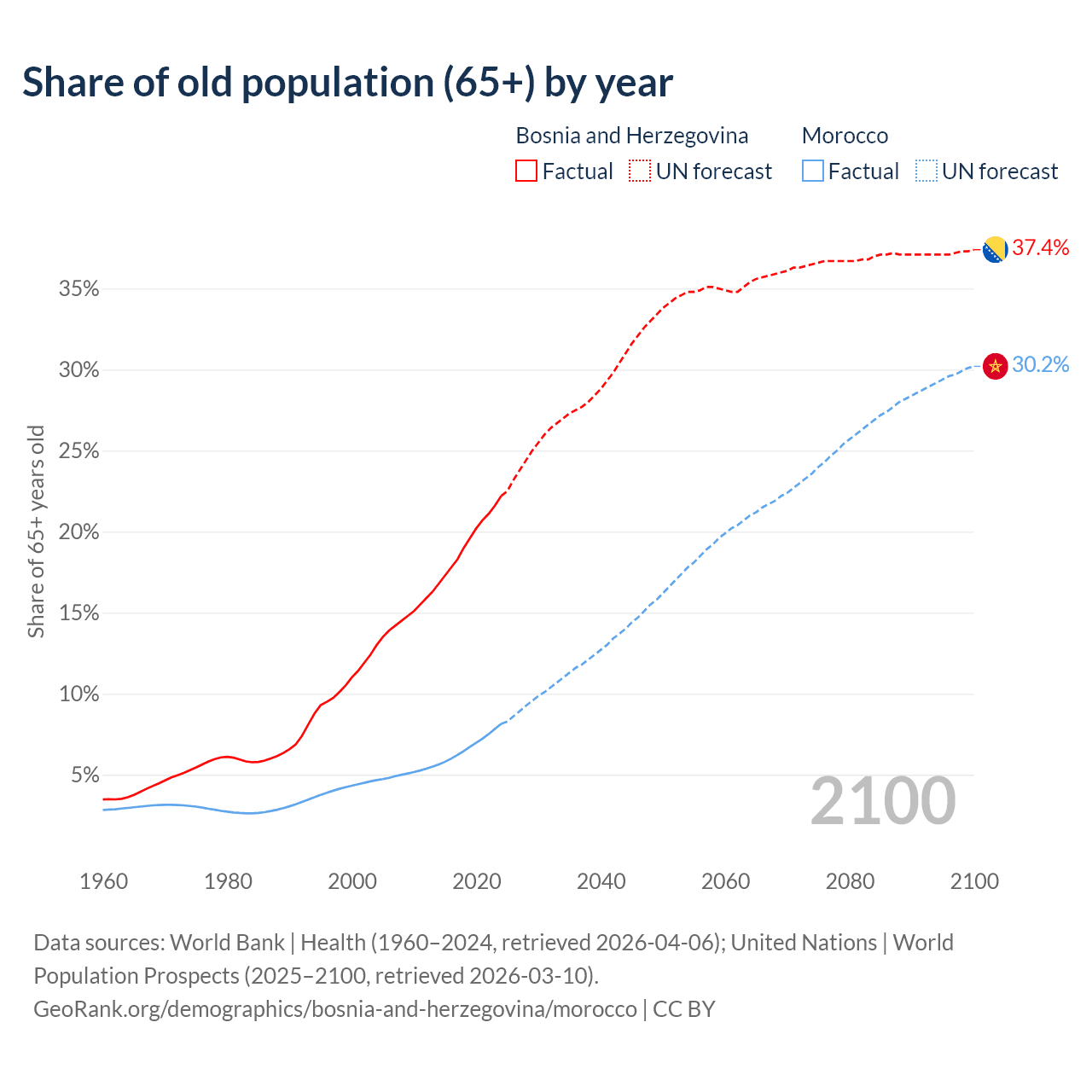 The share of older people aged 65 and over is 22.2% in Bosnia and Herzegovina and 8.14% in Morocco. Life expectancy in Bosnia and Herzegovina compared to Morocco .