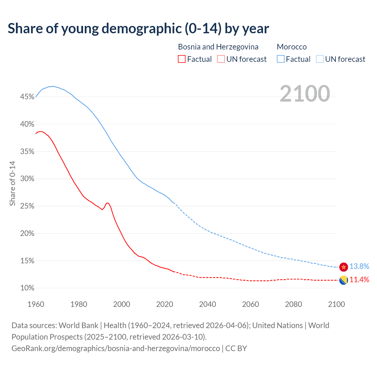 - The share of young demographic (0-15 years old) in Bosnia and Herzegovina is 13% vs 25.6% in Morocco.