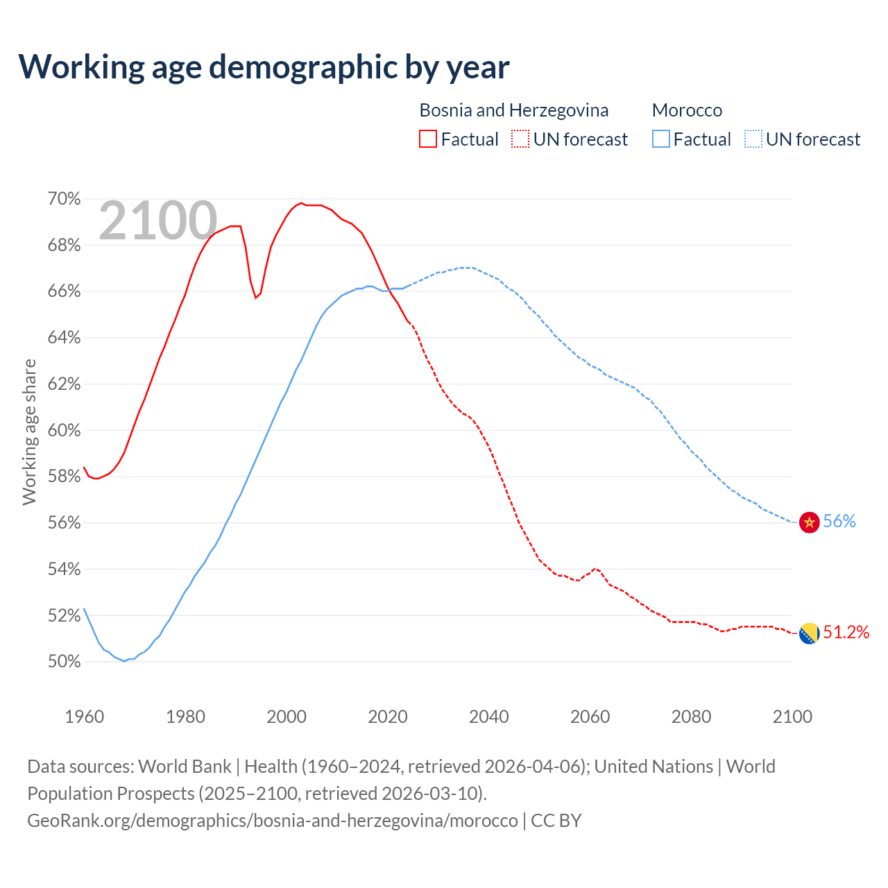 Median age Bosnia and Herzegovina vs Morocco, 1960-2100