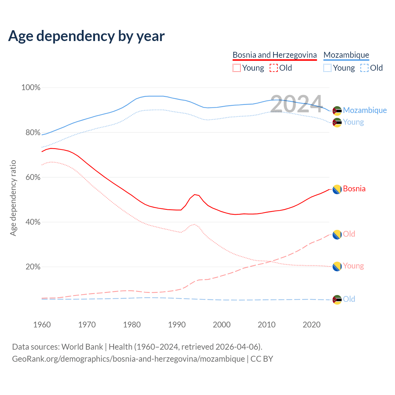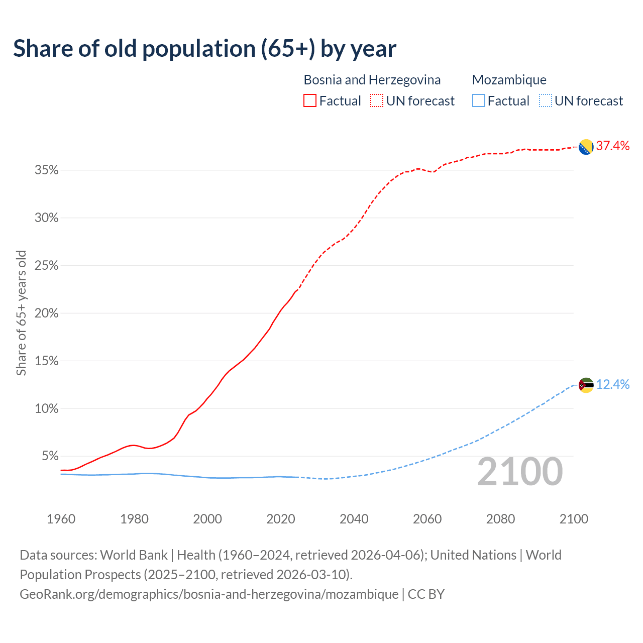 - The share of old-age demographic (65+) in Bosnia and Herzegovina is 22.2% vs 2.75% in Mozambique.