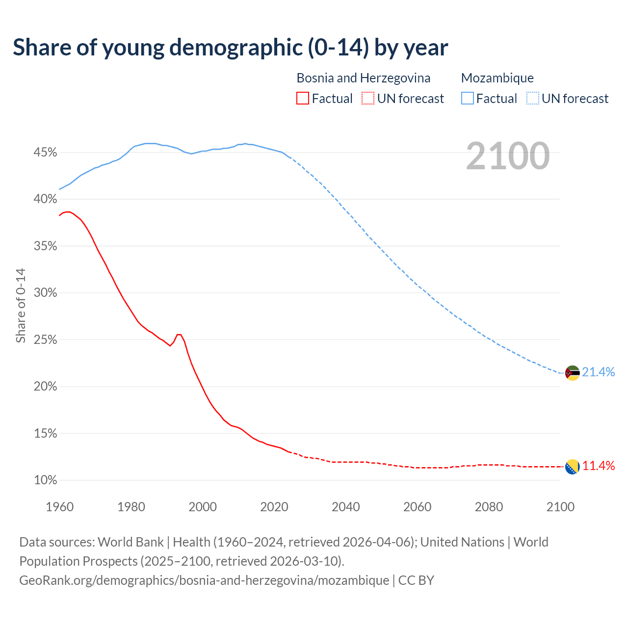 - The share of young demographic (0-15 years old) in Bosnia and Herzegovina is 13% vs 44.5% in Mozambique.