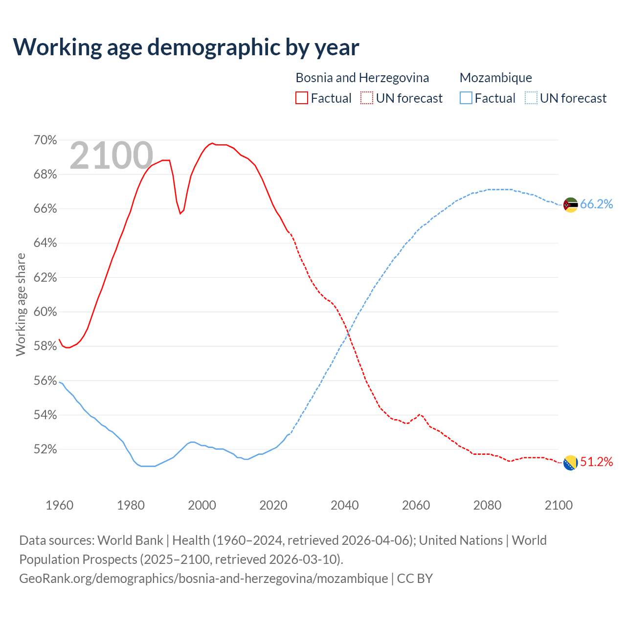 - Bosnia and Herzegovina has 2.02M working age adults (aged 15-64) vs 19.5M in Mozambique.
