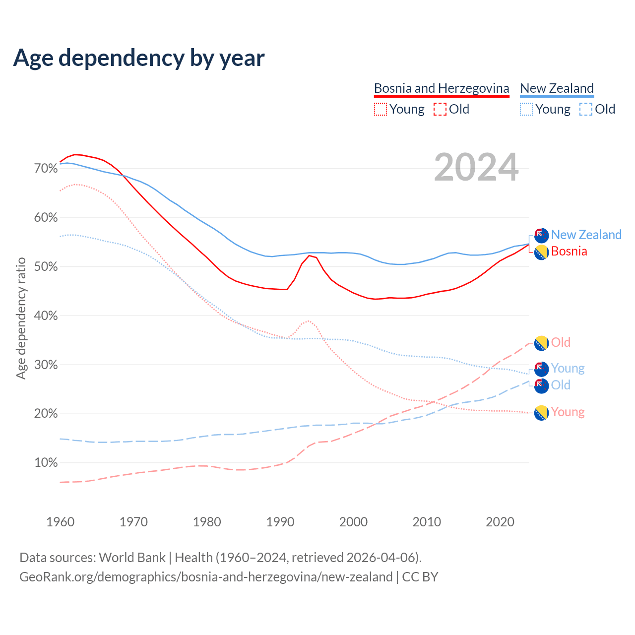 - Bosnia and Herzegovina is ranked 8/196 by median age (oldest to youngest) vs 56/196 for New Zealand.