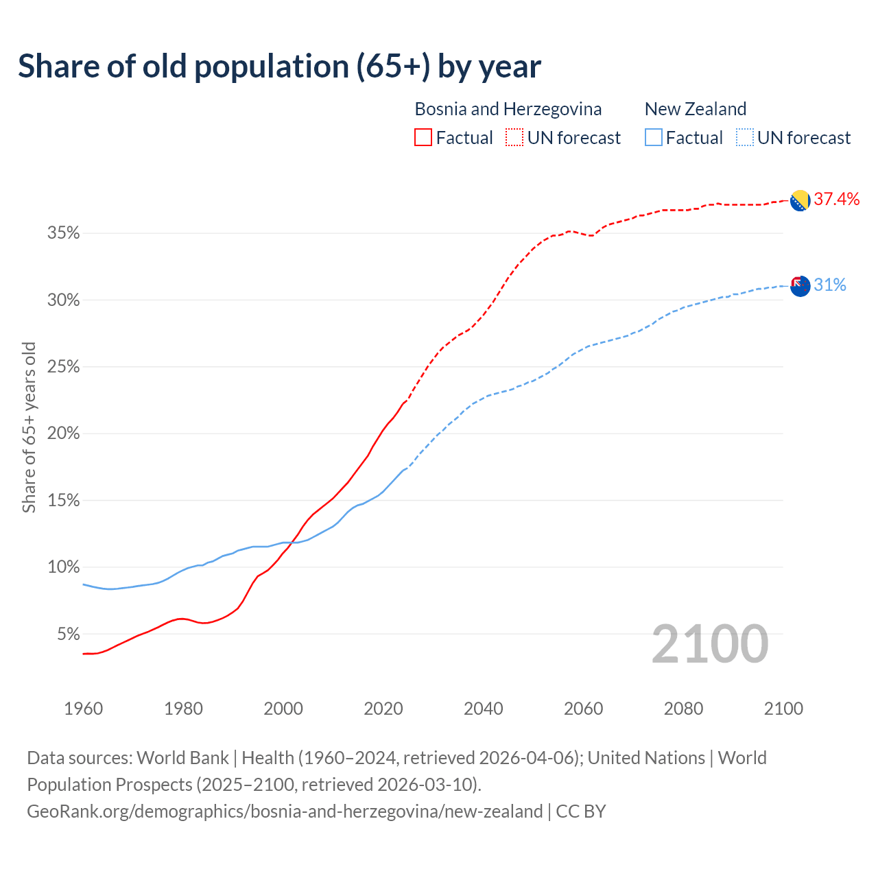 - The share of old-age demographic (65+) in Bosnia and Herzegovina is 22.2% vs 17.2% in New Zealand.