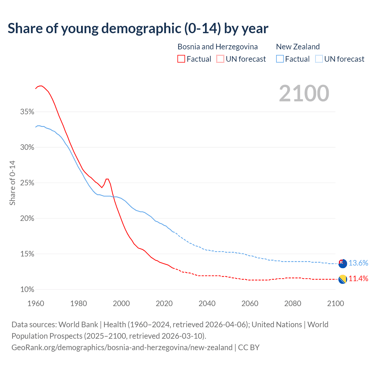 - The share of young demographic (0-15 years old) in Bosnia and Herzegovina is 13% vs 18.1% in New Zealand.