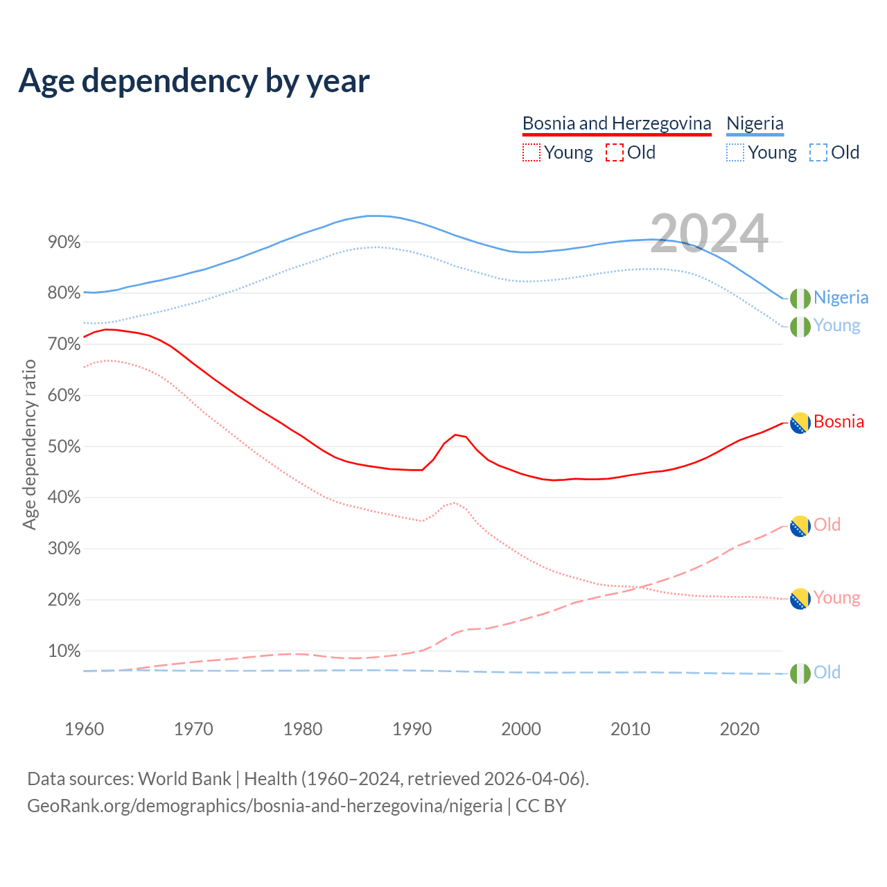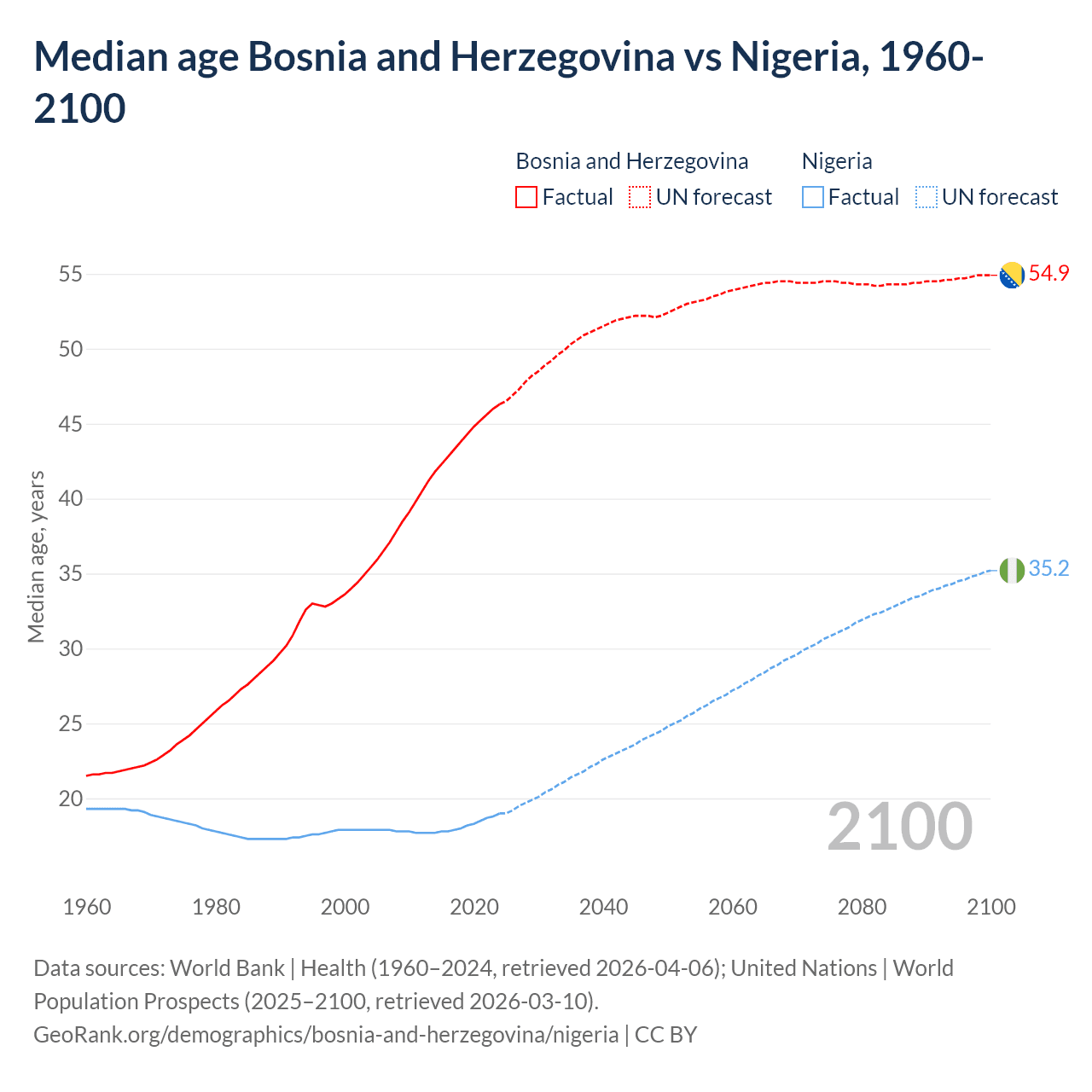 - Bosnia and Herzegovina is ranked 8/196 by median age (oldest to youngest) vs 178/196 for Nigeria.
