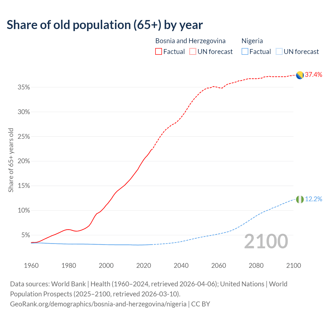 - The share of old-age demographic (65+) in Bosnia and Herzegovina is 22.2% vs 3.05% in Nigeria.
