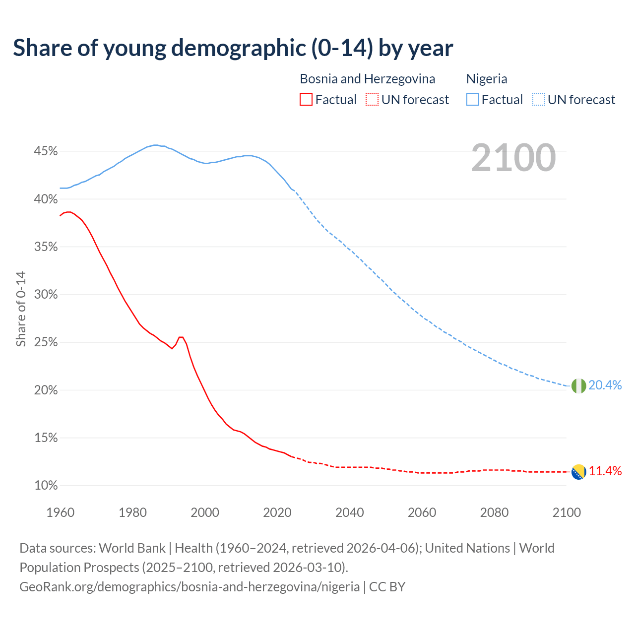 - The share of young demographic (0-15 years old) in Bosnia and Herzegovina is 13% vs 41% in Nigeria.