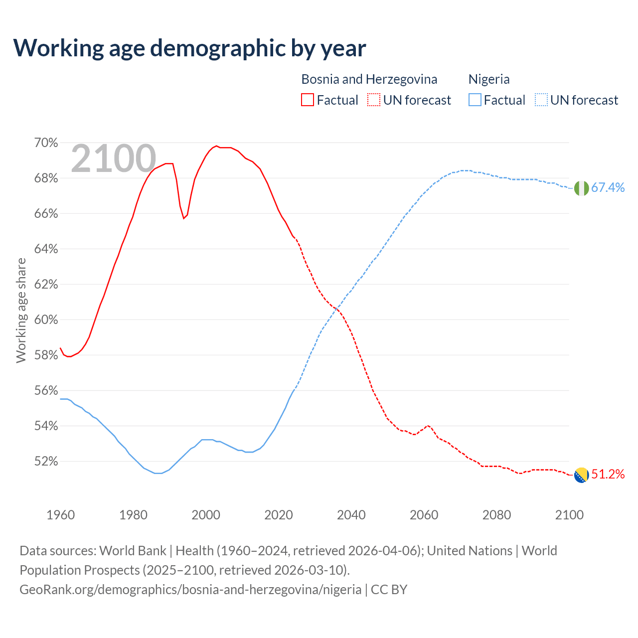 - Bosnia and Herzegovina has 2.02M working age adults (aged 15-64) vs 136M in Nigeria.