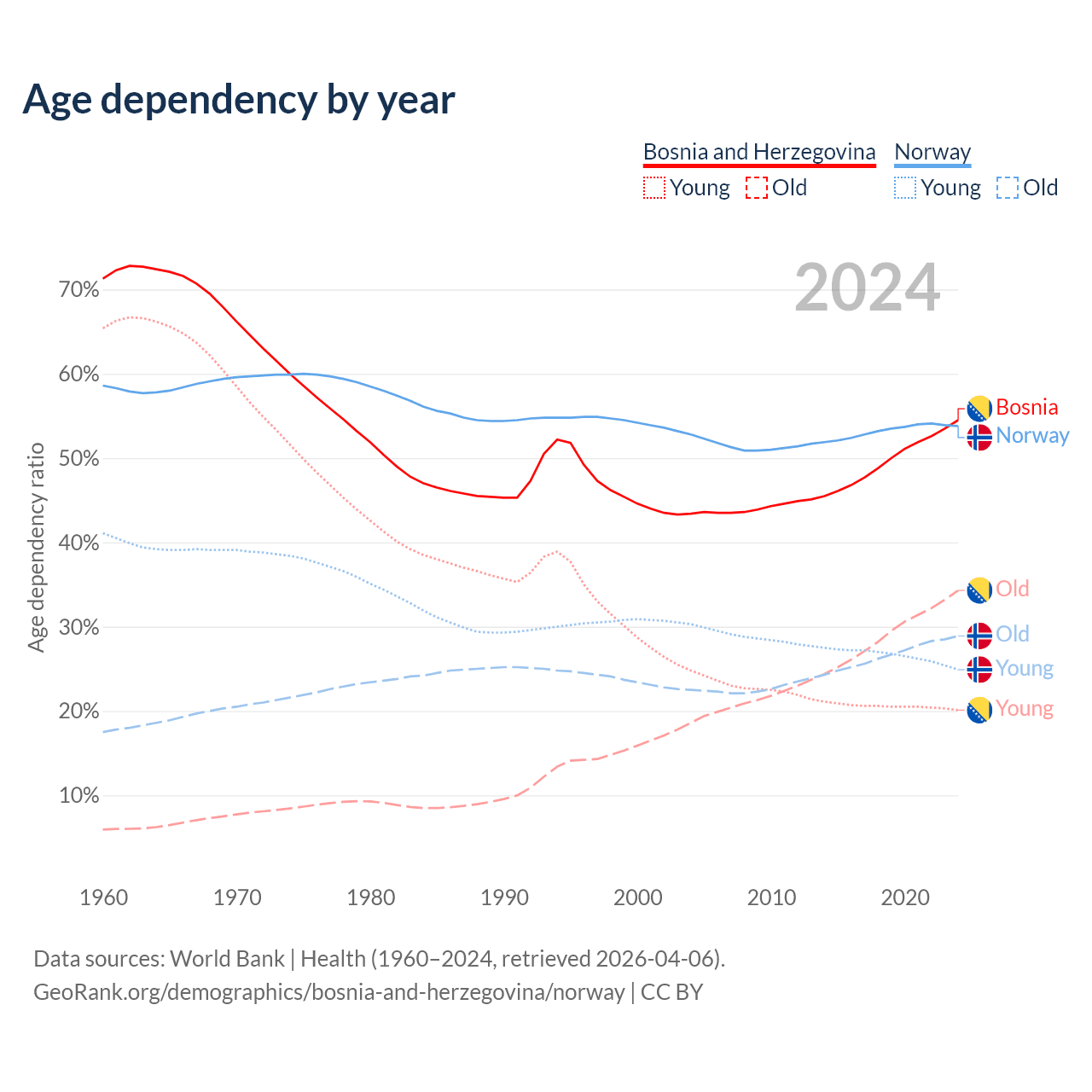 - Bosnia and Herzegovina is ranked 8/196 by median age (oldest to youngest) vs 43/196 for Norway.