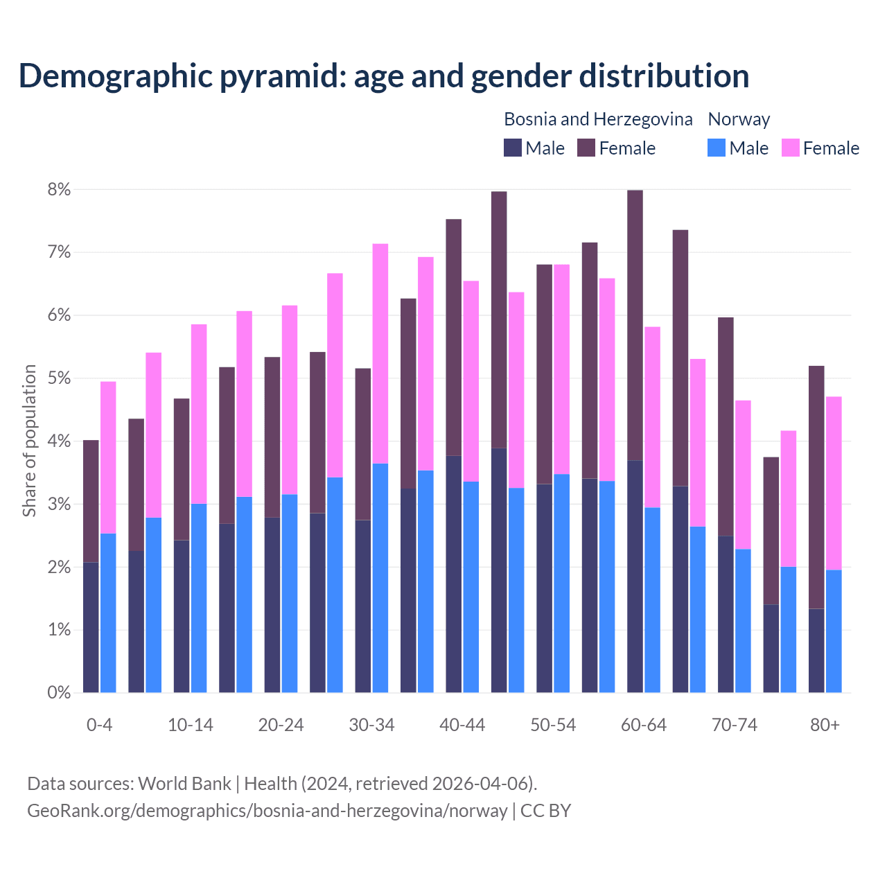 The share of older people aged 65 and over is 22.2% in Bosnia and Herzegovina and 18.8% in Norway. Life expectancy in Bosnia and Herzegovina compared to Norway .