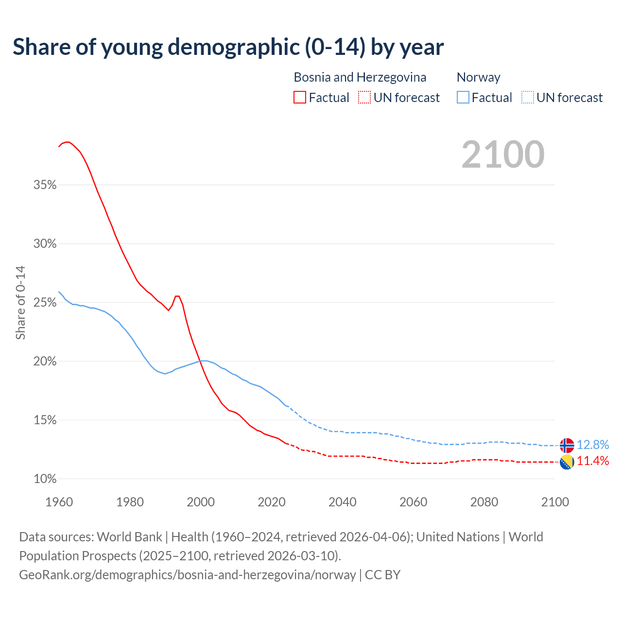 - The share of young demographic (0-15 years old) in Bosnia and Herzegovina is 13% vs 16.2% in Norway.