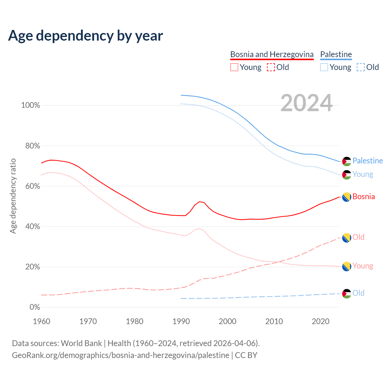 - The share of old-age demographic (65+) in Bosnia and Herzegovina is 22.2% vs 3.84% in Palestine.