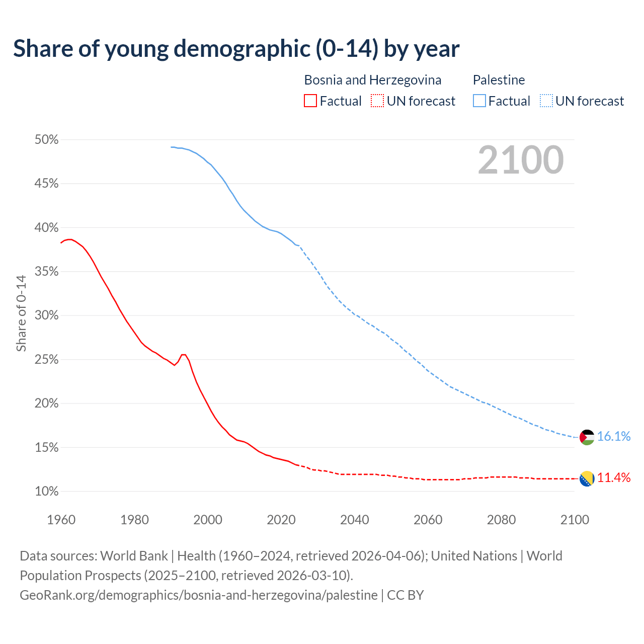 - The share of young demographic (0-15 years old) in Bosnia and Herzegovina is 13% vs 38% in Palestine.