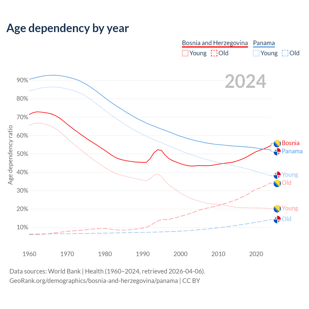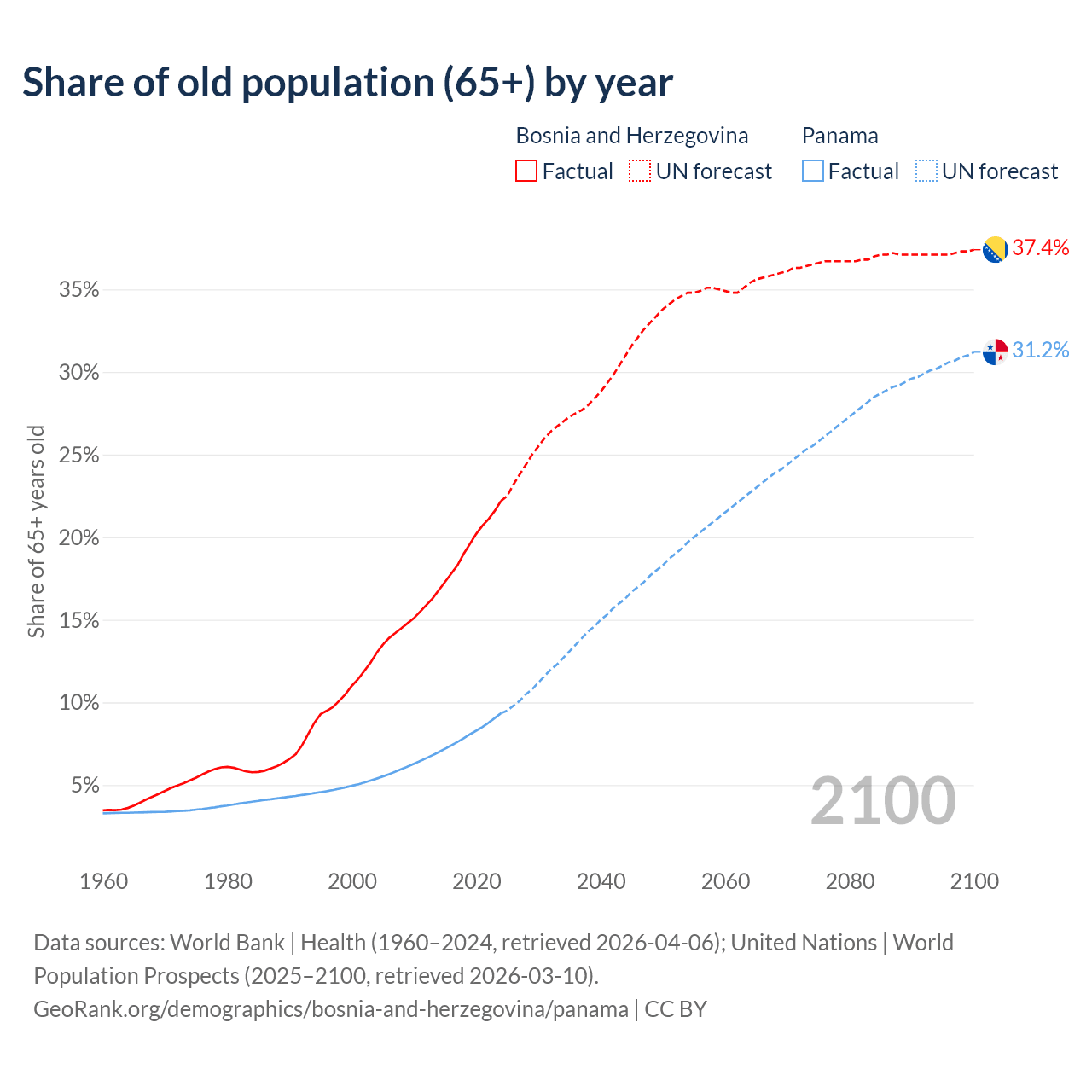 - The share of old-age demographic (65+) in Bosnia and Herzegovina is 22.2% vs 9.35% in Panama.