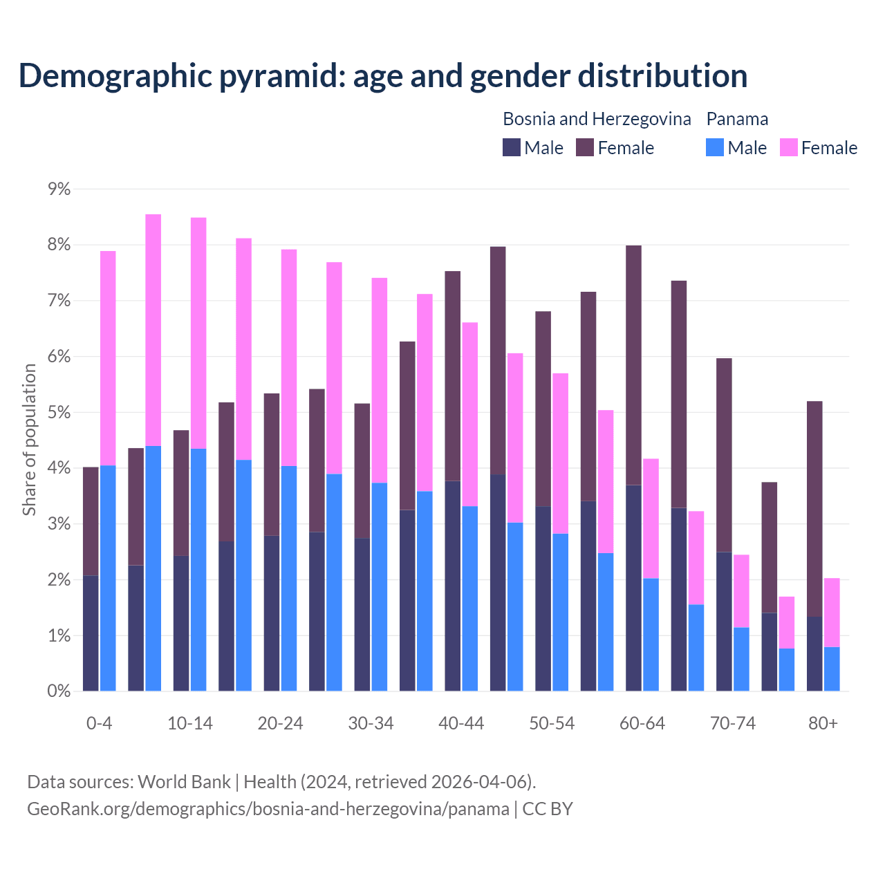 - Bosnia and Herzegovina is ranked 8/196 by median age (oldest to youngest) vs 94/196 for Panama.