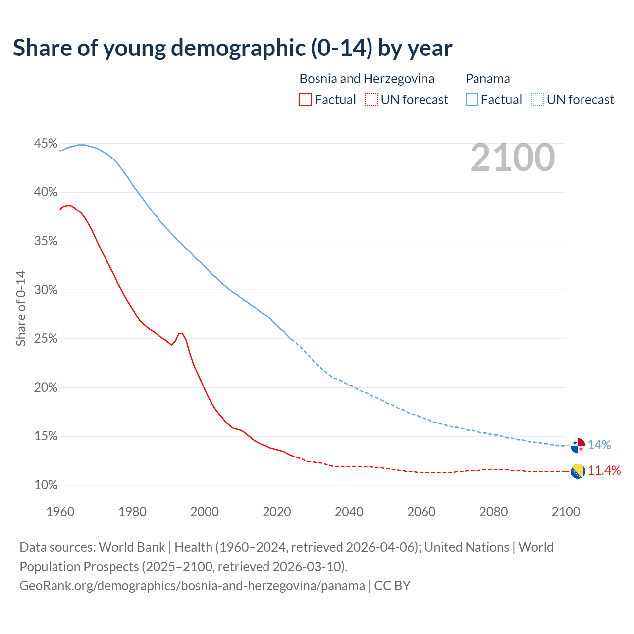 - The share of young demographic (0-15 years old) in Bosnia and Herzegovina is 13% vs 24.9% in Panama.