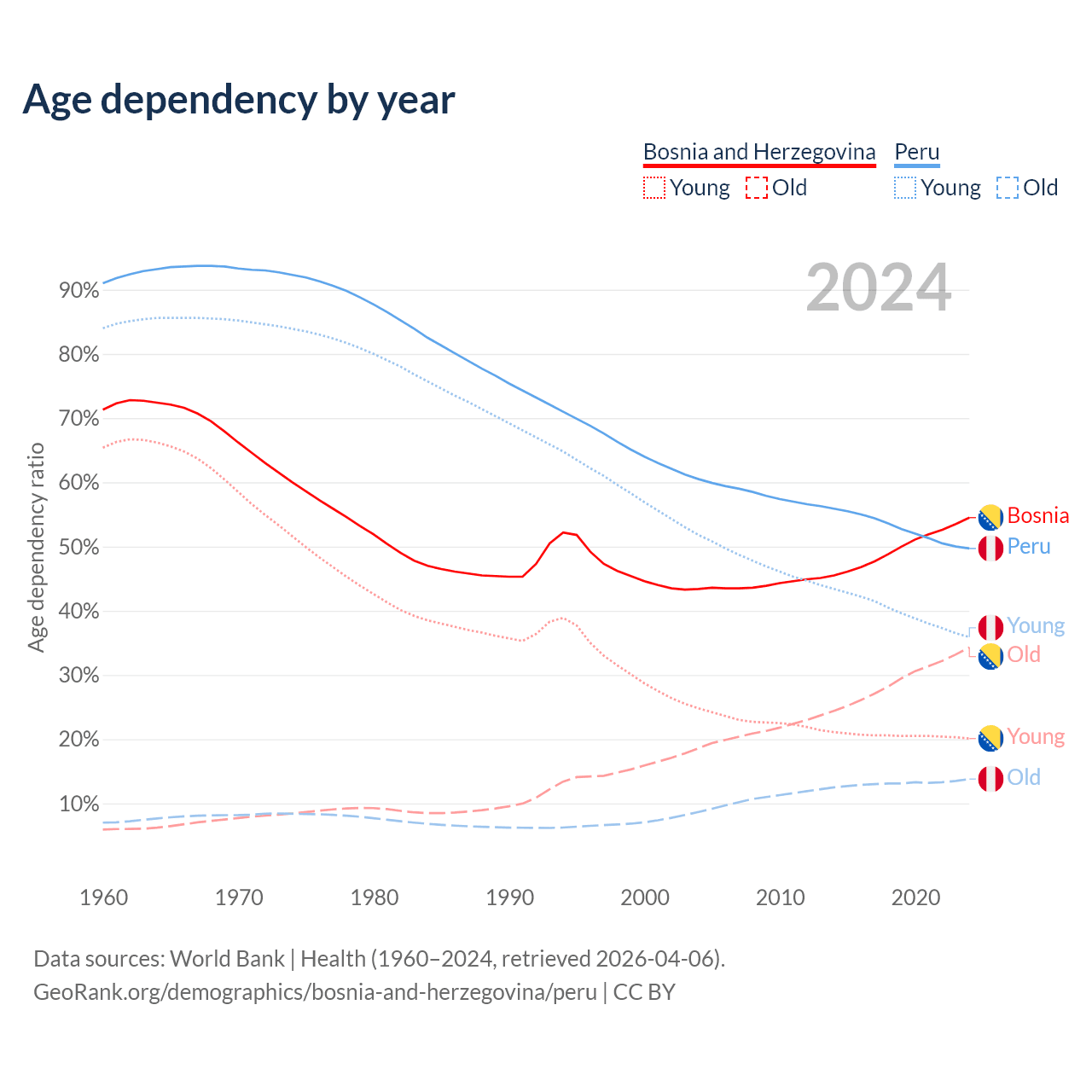 - The share of old-age demographic (65+) in Bosnia and Herzegovina is 22.2% vs 9.23% in Peru.