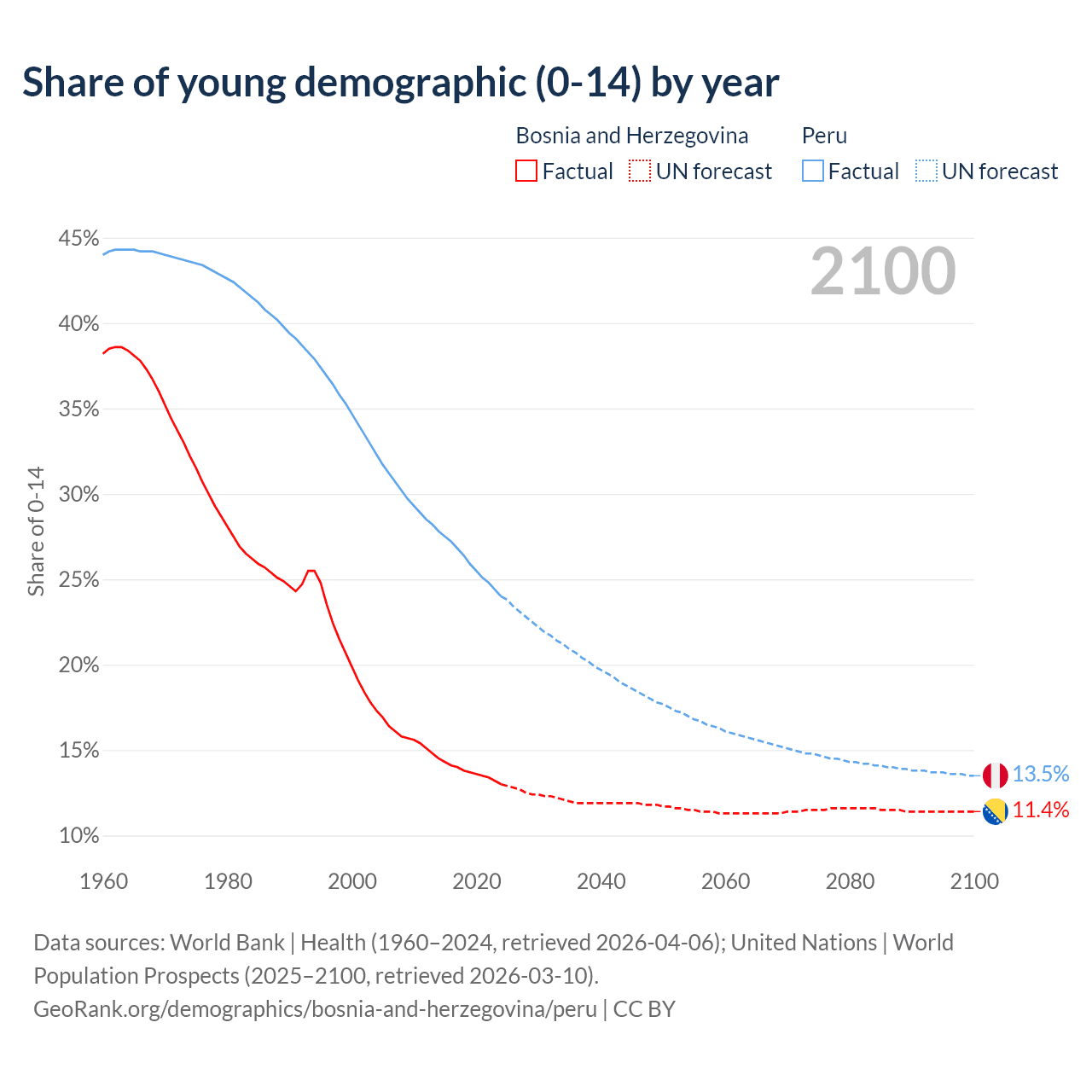 - The share of young demographic (0-15 years old) in Bosnia and Herzegovina is 13% vs 24% in Peru.