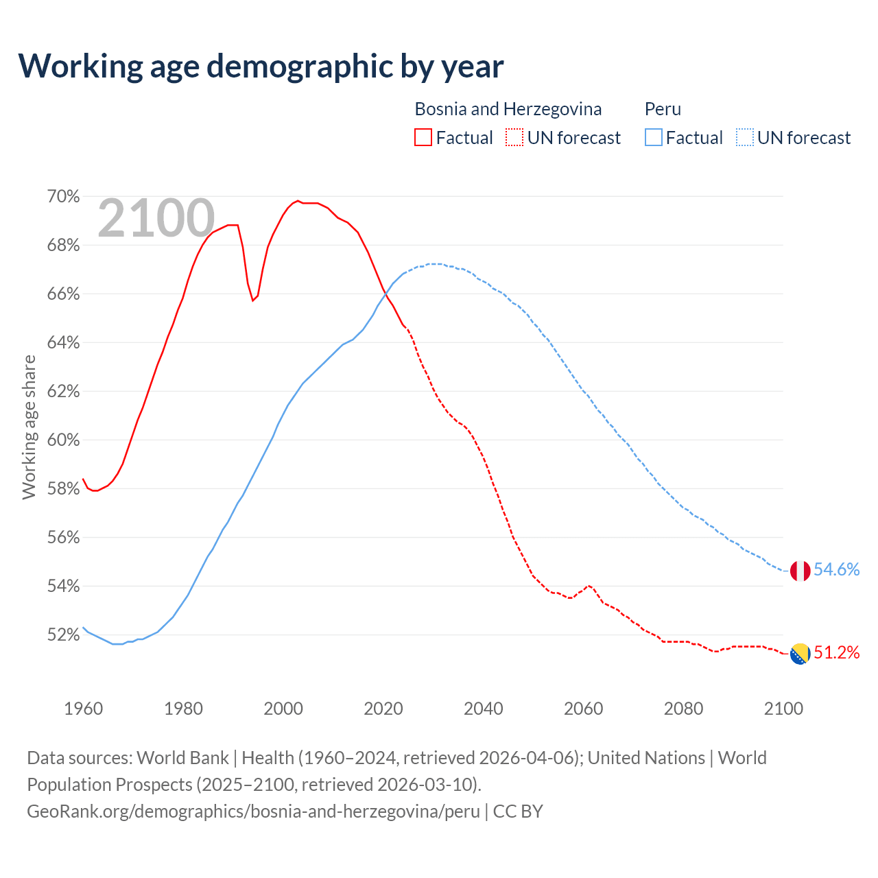 Median age Bosnia and Herzegovina vs Peru, 1960-2100