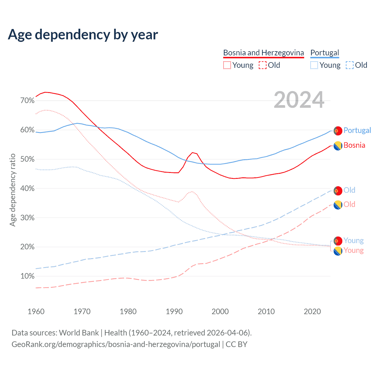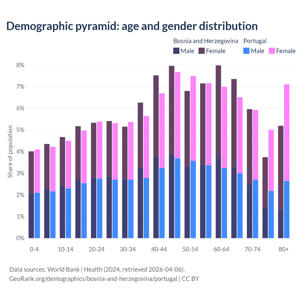 - Bosnia and Herzegovina is ranked 8/196 by median age (oldest to youngest) vs 5/196 for Portugal.