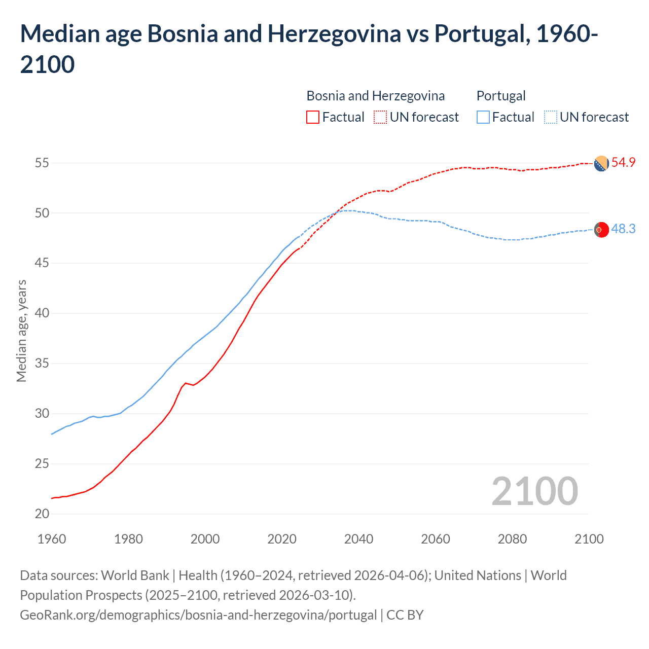 Median age Bosnia and Herzegovina vs Portugal, 1960-2100