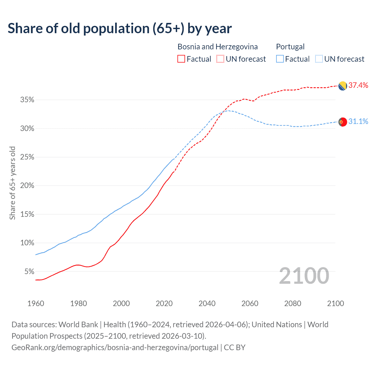 The share of older people aged 65 and over is 22.2% in Bosnia and Herzegovina and 24.5% in Portugal. Life expectancy in Bosnia and Herzegovina compared to Portugal .