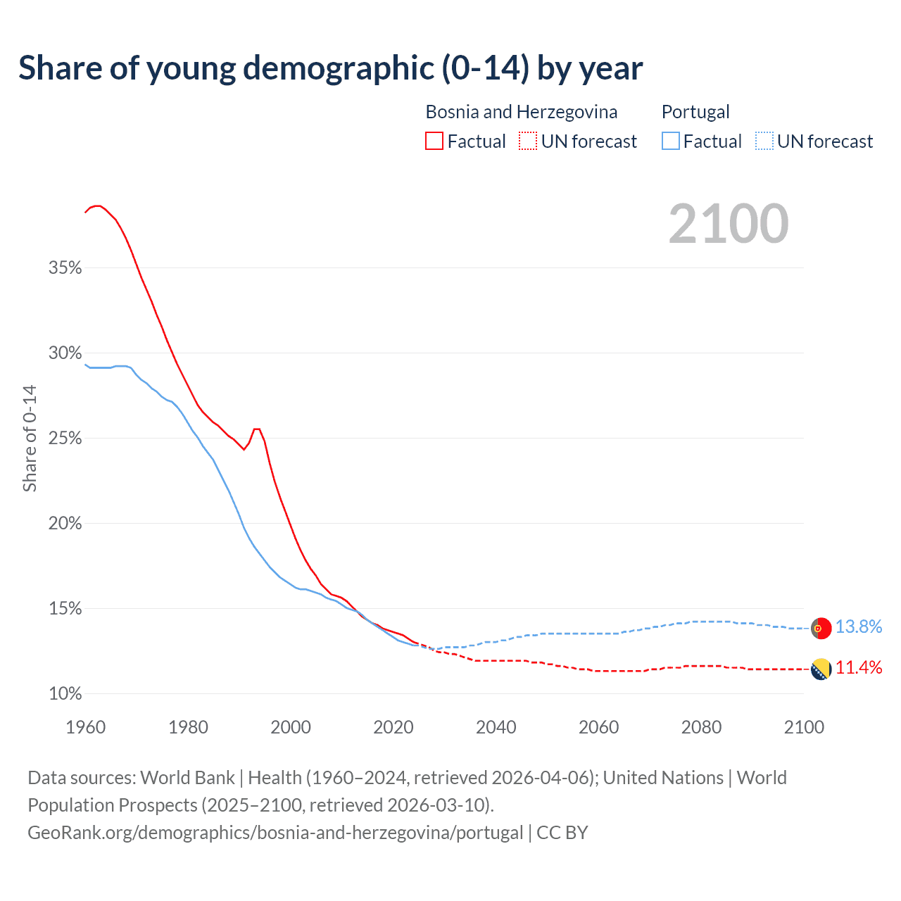 - The share of young demographic (0-15 years old) in Bosnia and Herzegovina is 13% vs 12.8% in Portugal.