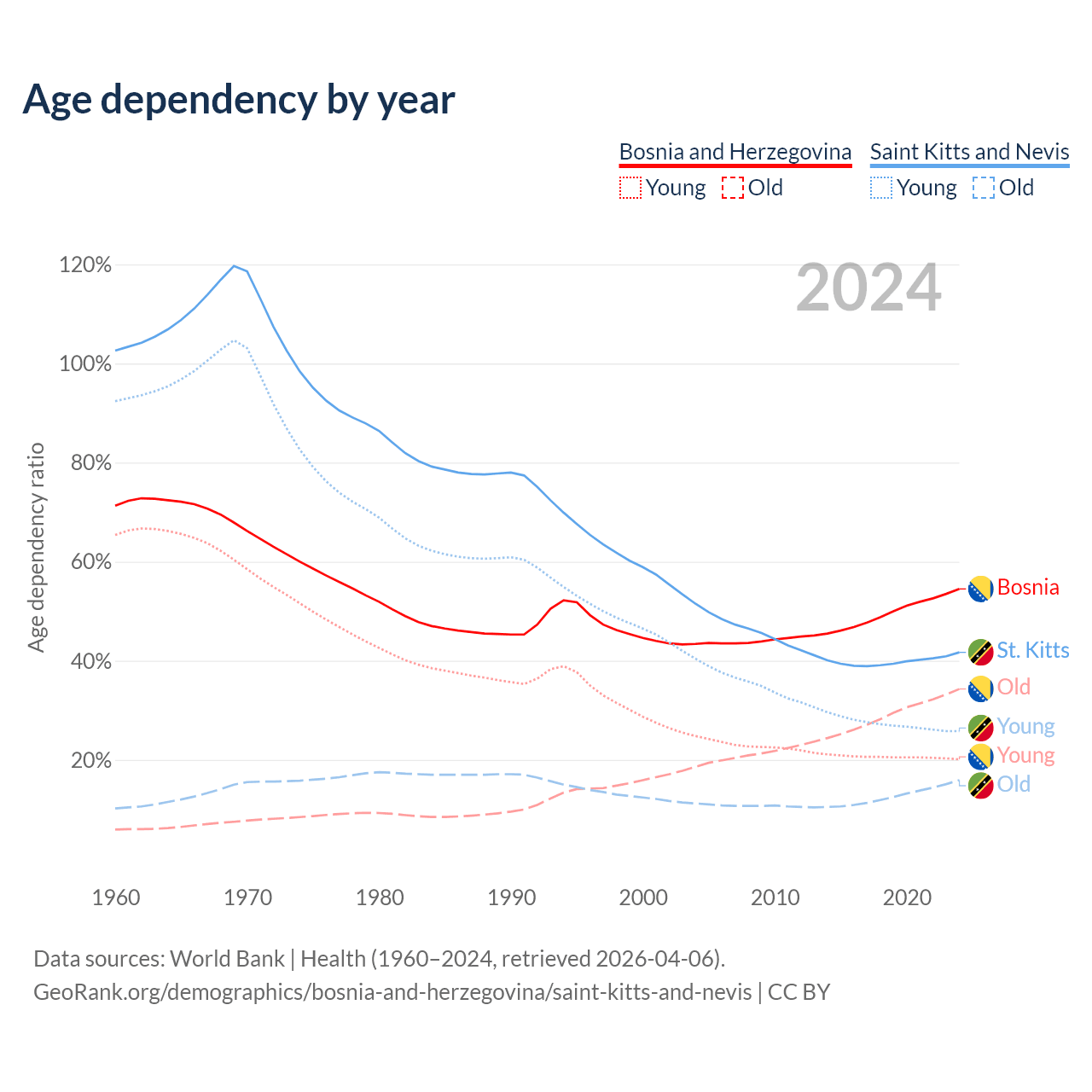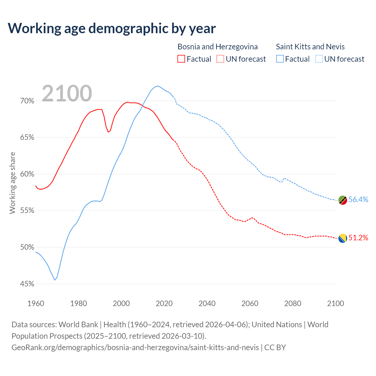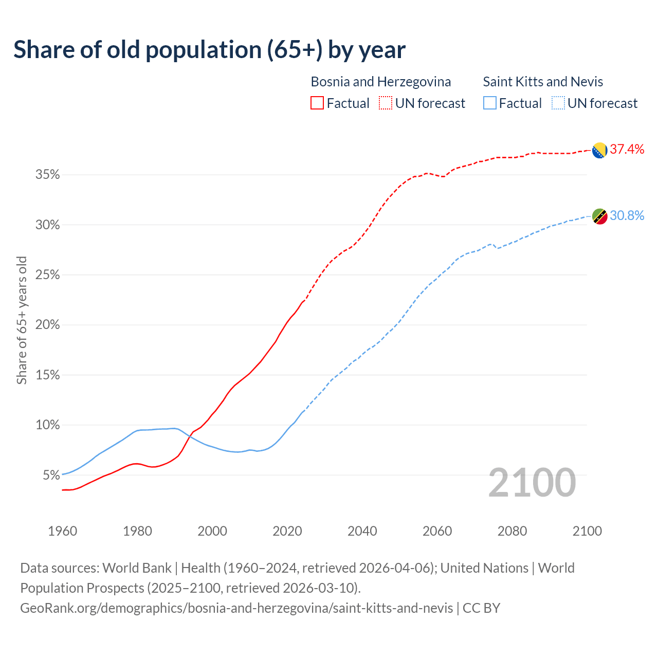 The share of older people aged 65 and over is 22.2% in Bosnia and Herzegovina and 11.2% in Saint Kitts and Nevis. Life expectancy in Bosnia and Herzegovina compared to Saint Kitts and Nevis .