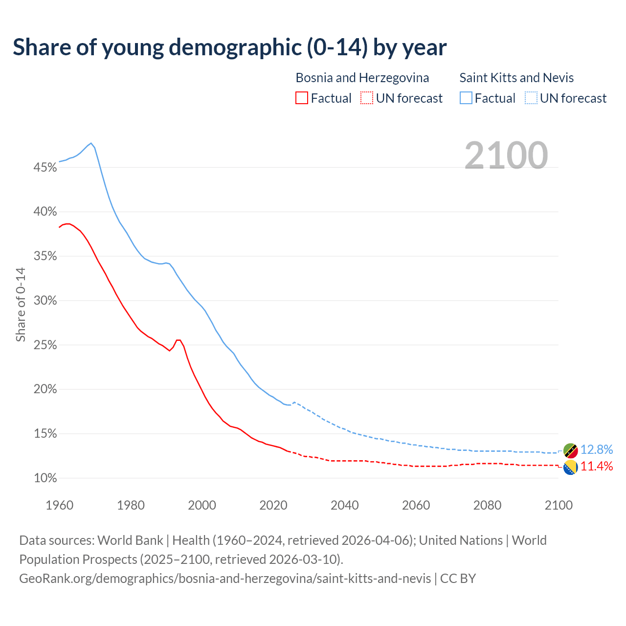 - The share of young demographic (0-15 years old) in Bosnia and Herzegovina is 13% vs 18.2% in Saint Kitts and Nevis.
