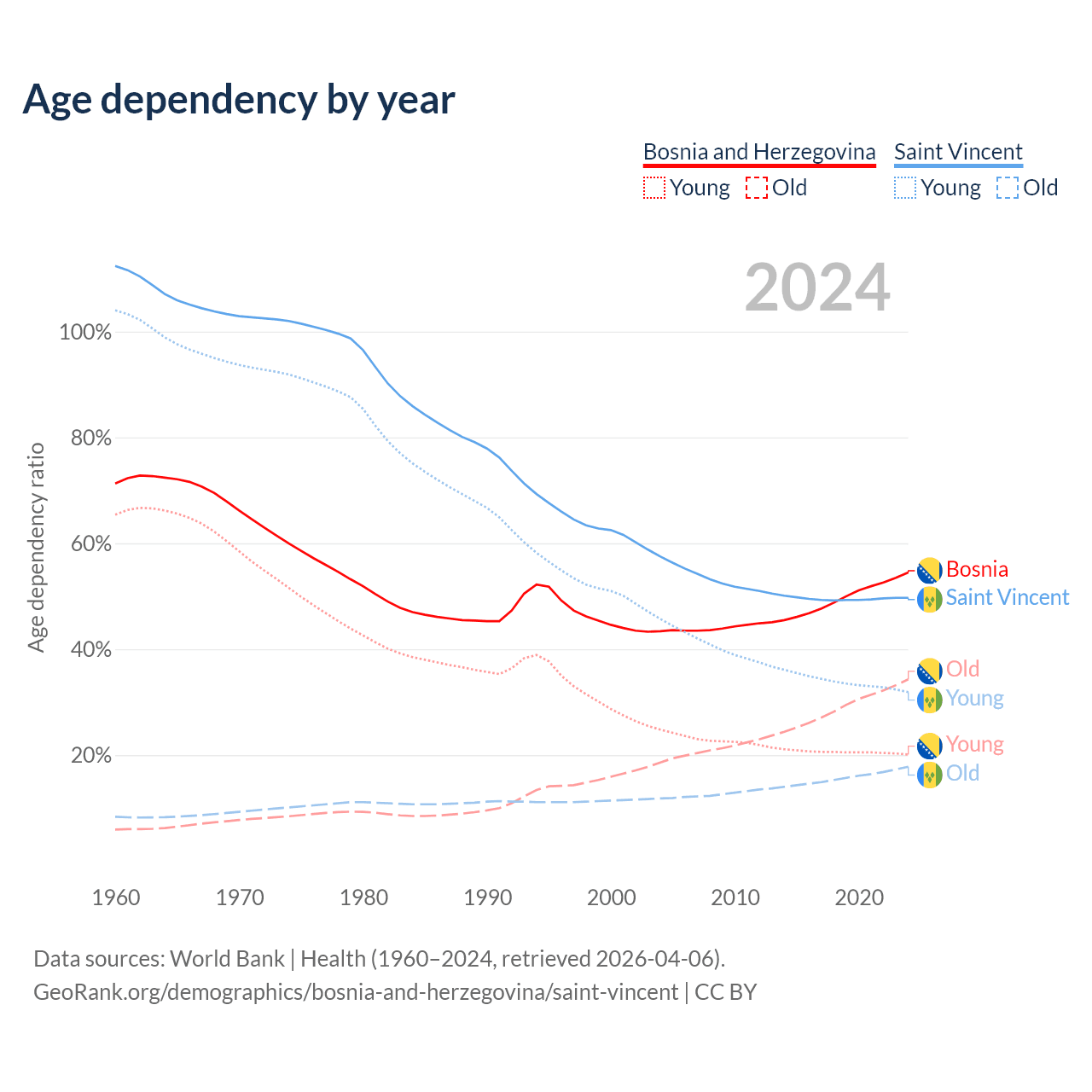 - The share of old-age demographic (65+) in Bosnia and Herzegovina is 22.2% vs 11.9% in Saint Vincent.