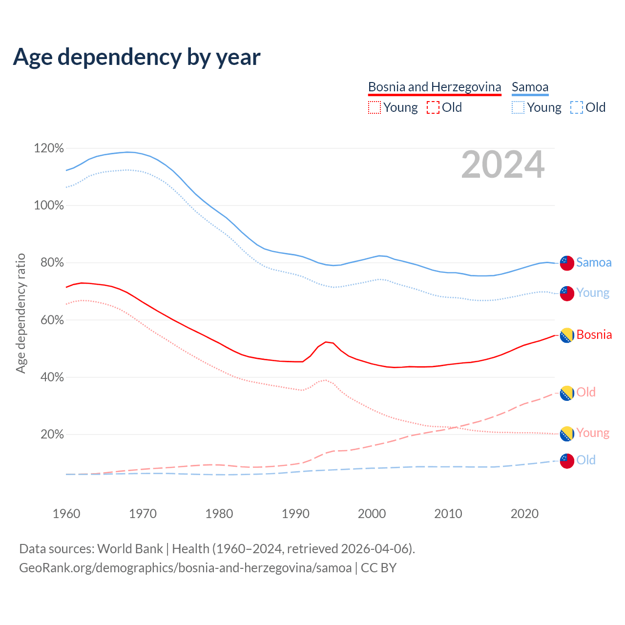 - The share of old-age demographic (65+) in Bosnia and Herzegovina is 22.2% vs 5.88% in Samoa.
