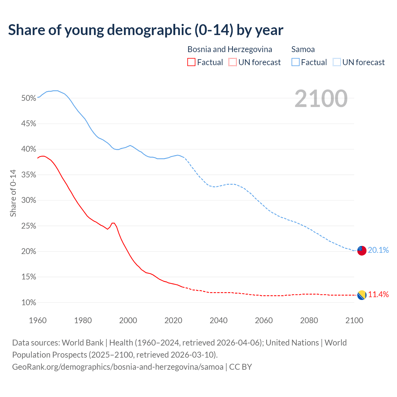 - The share of young demographic (0-15 years old) in Bosnia and Herzegovina is 13% vs 38.5% in Samoa.