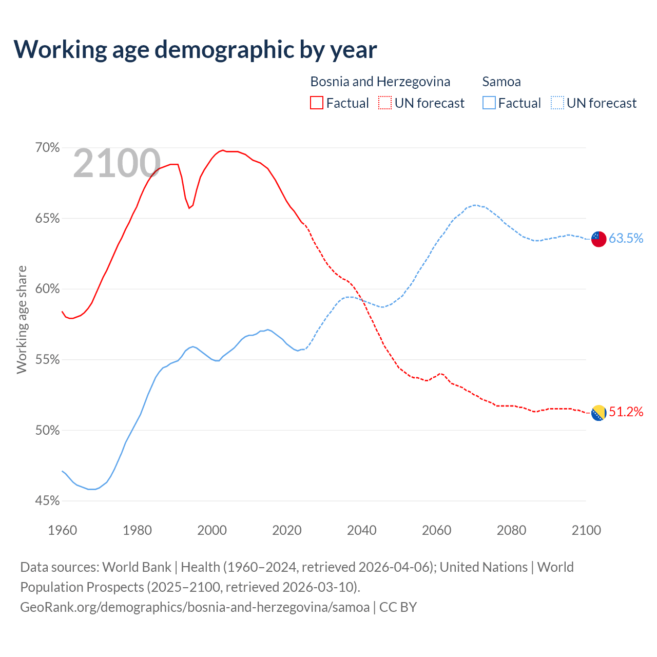 - Bosnia and Herzegovina has 2.02M working age adults (aged 15-64) vs 123K in Samoa.