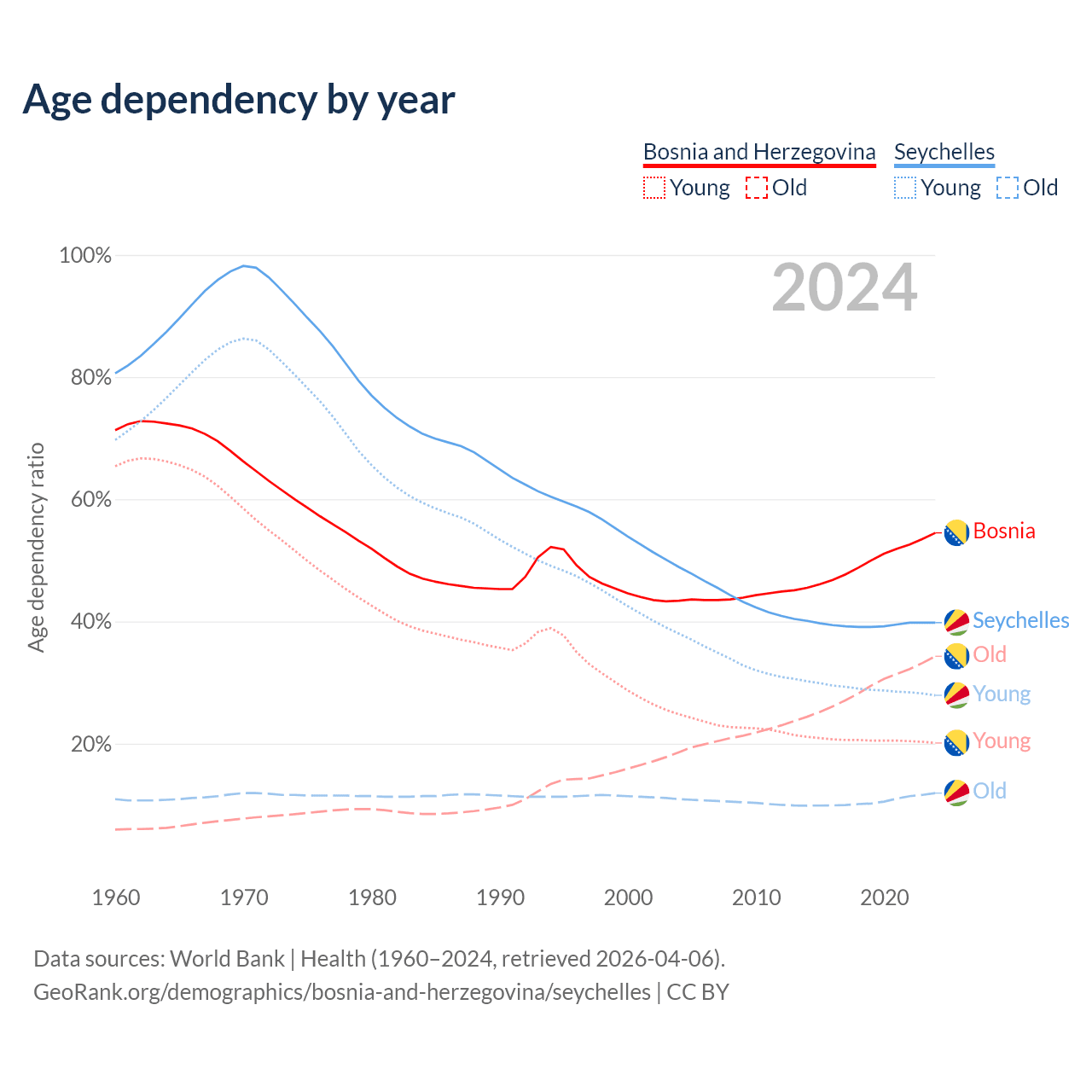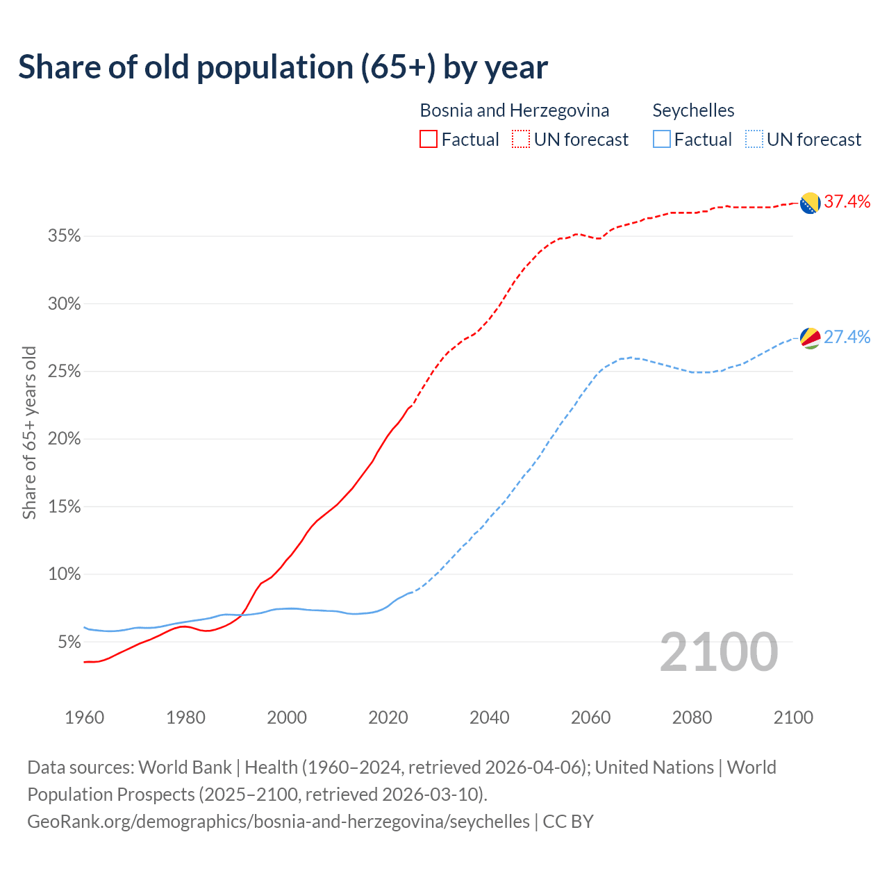 - The share of old-age demographic (65+) in Bosnia and Herzegovina is 22.2% vs 8.54% in the Seychelles.
