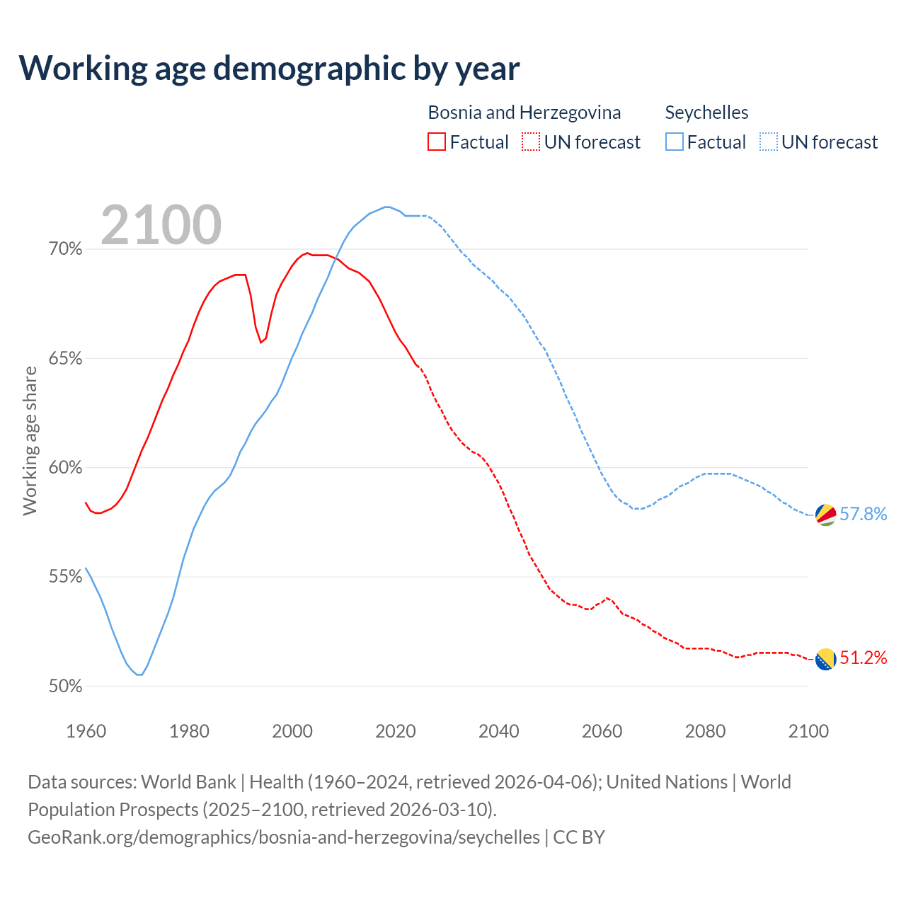Median age Bosnia and Herzegovina vs Seychelles, 1960-2100