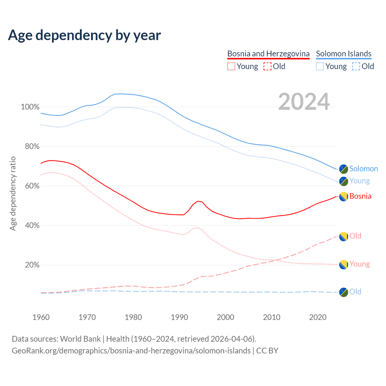 - Bosnia and Herzegovina is ranked 8/196 by median age (oldest to youngest) vs 153/196 for the Solomon Islands.