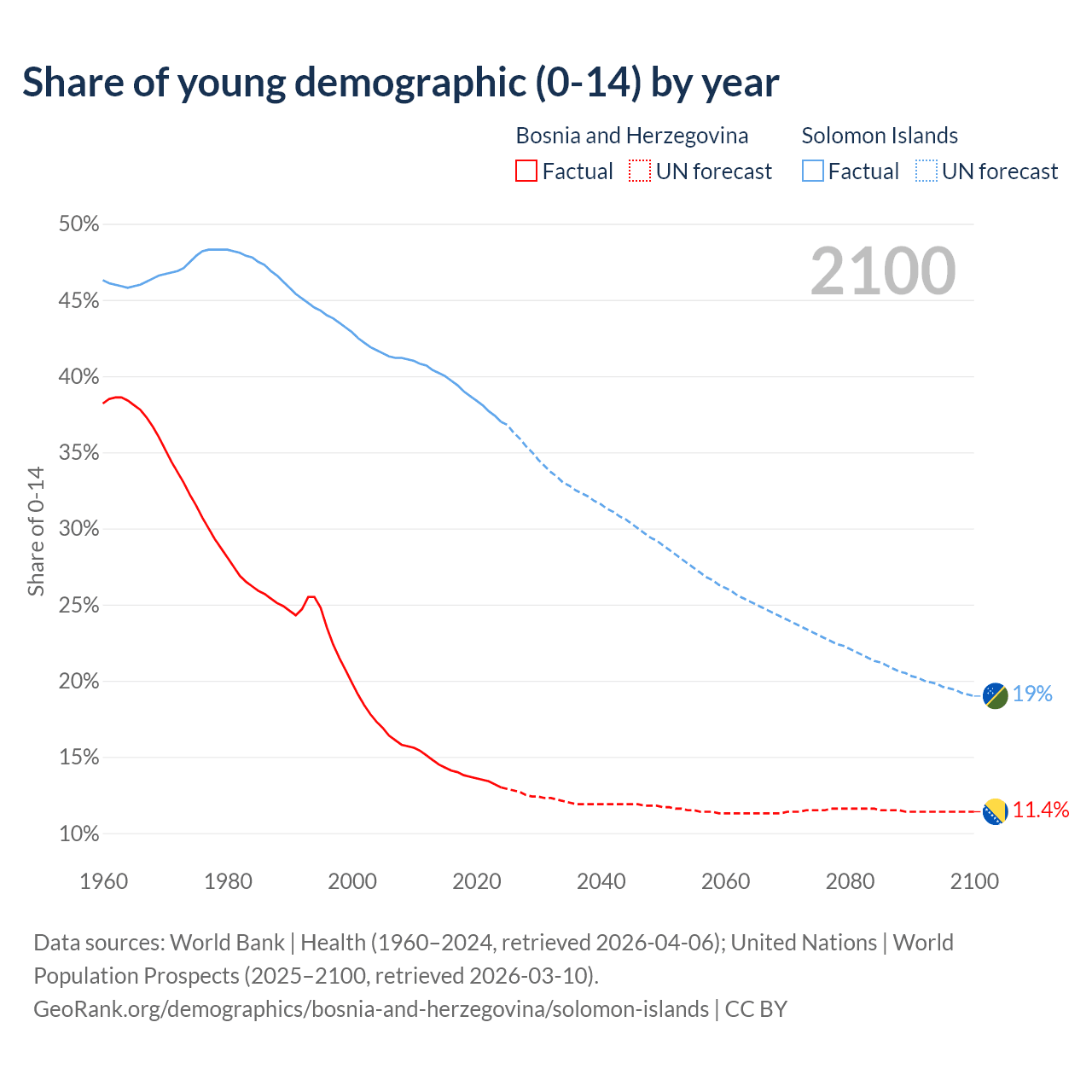 - The share of young demographic (0-15 years old) in Bosnia and Herzegovina is 13% vs 37% in the Solomon Islands.