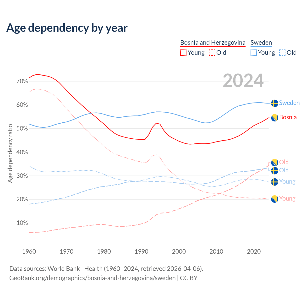 - The share of old-age demographic (65+) in Bosnia and Herzegovina is 22.2% vs 20.7% in Sweden.
