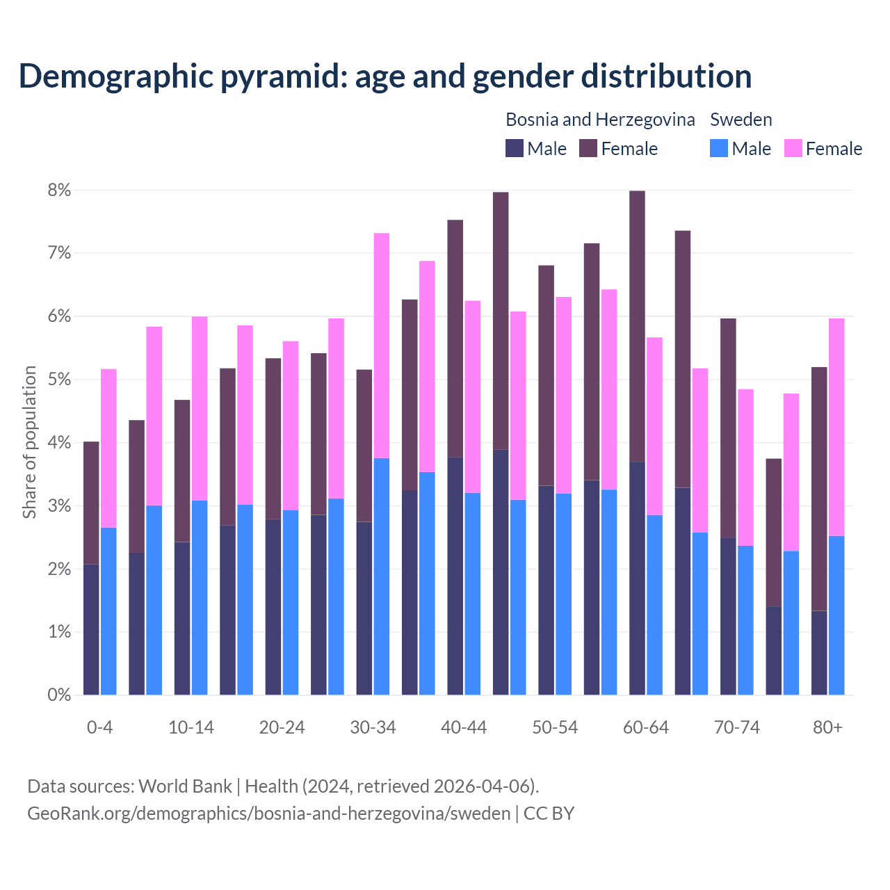 - Bosnia and Herzegovina is ranked 8/196 by median age (oldest to youngest) vs 39/196 for Sweden.