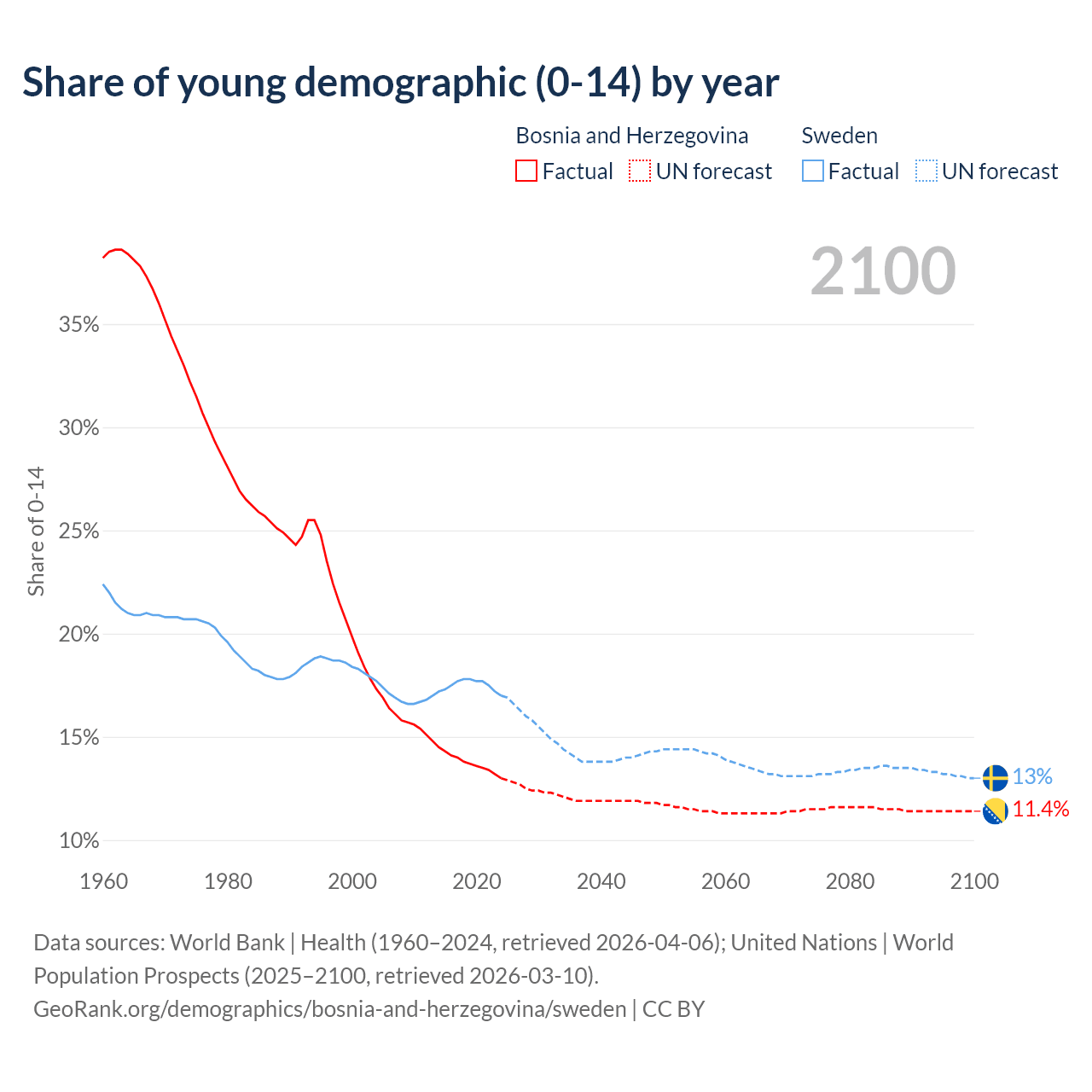 - The share of young demographic (0-15 years old) in Bosnia and Herzegovina is 13% vs 17% in Sweden.