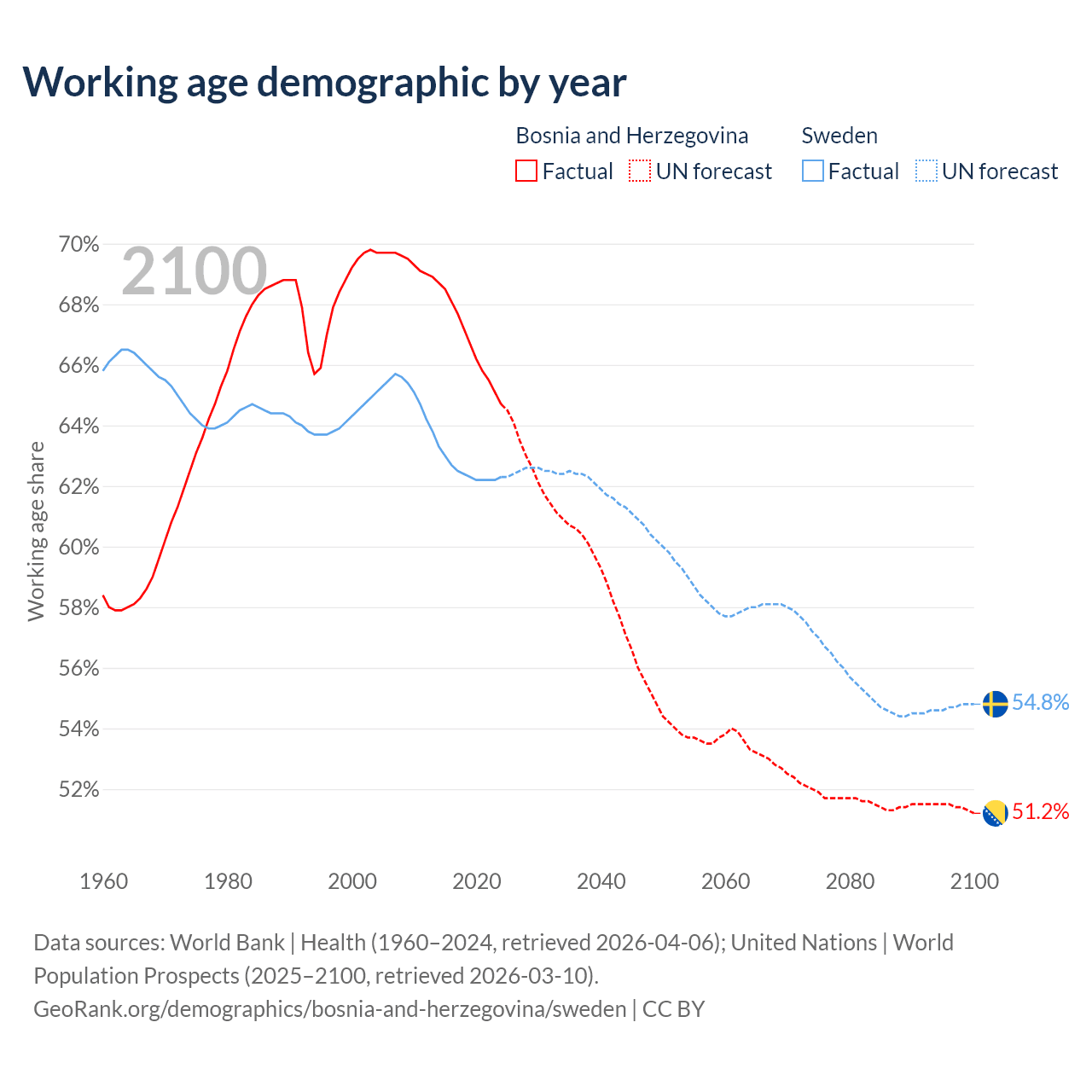 Median age Bosnia and Herzegovina vs Sweden, 1960-2100