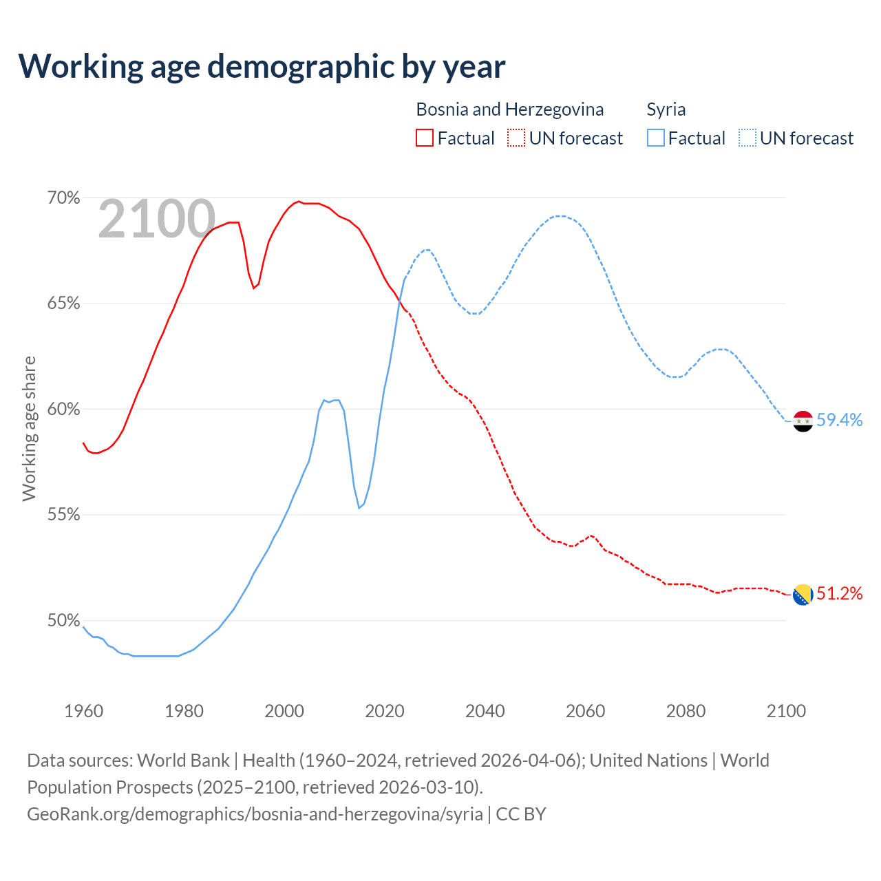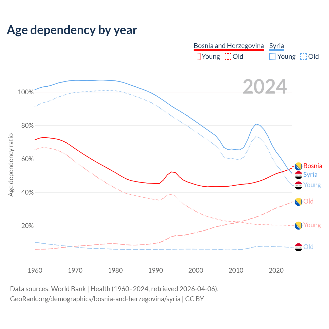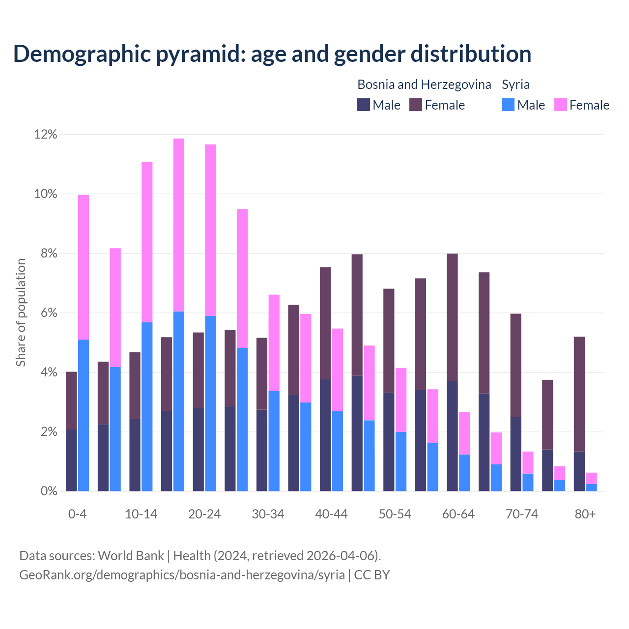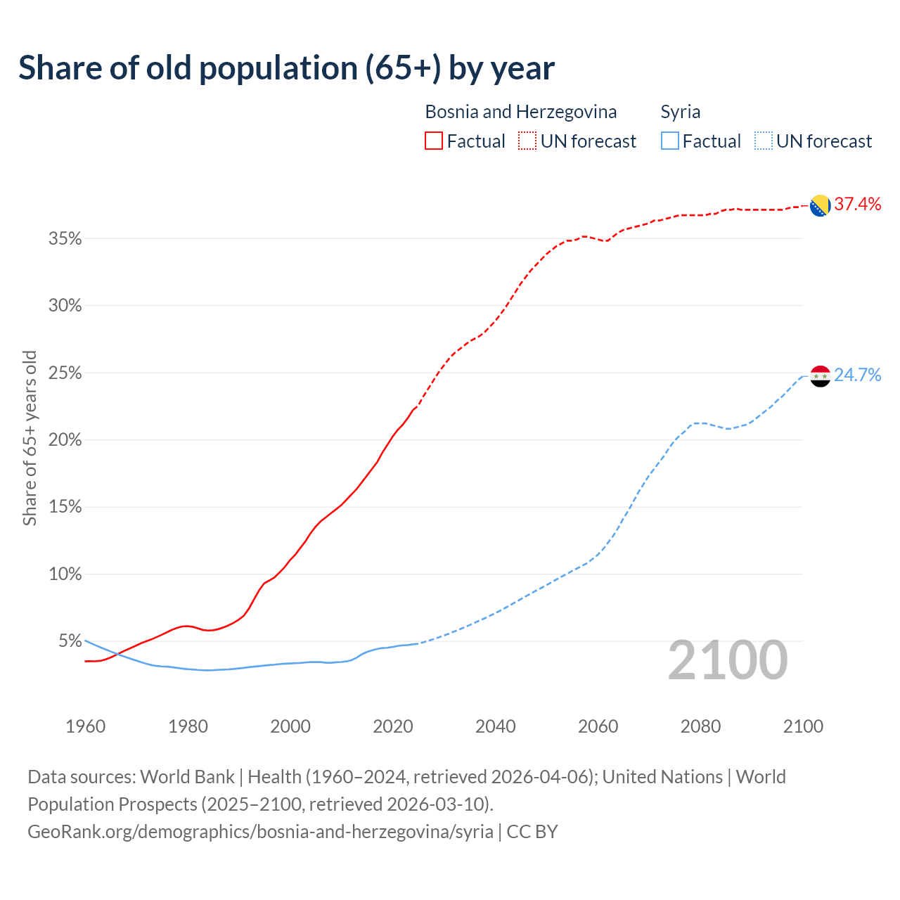 - The share of old-age demographic (65+) in Bosnia and Herzegovina is 22.2% vs 4.74% in Syria.