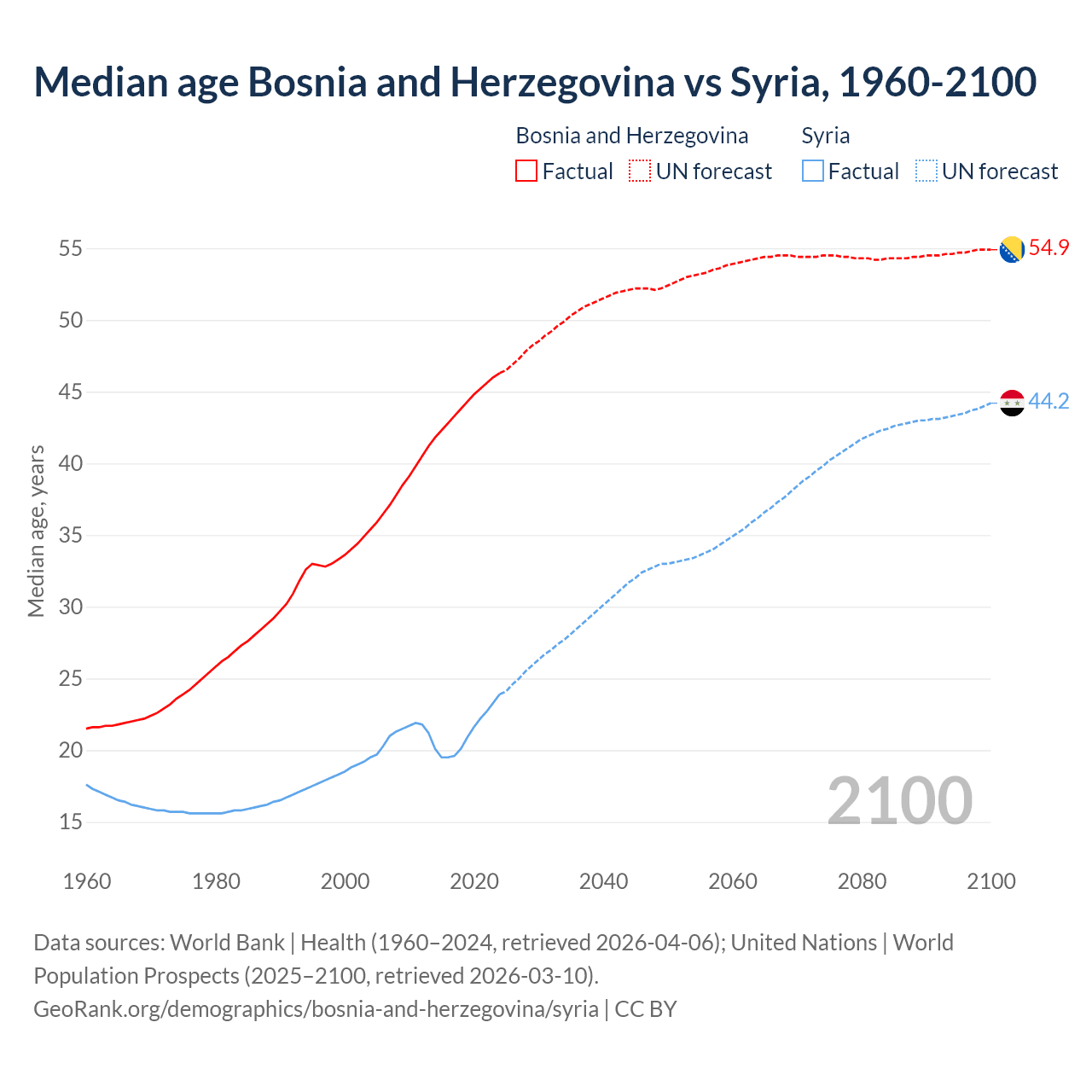 Median age Bosnia and Herzegovina vs Syria, 1960-2100