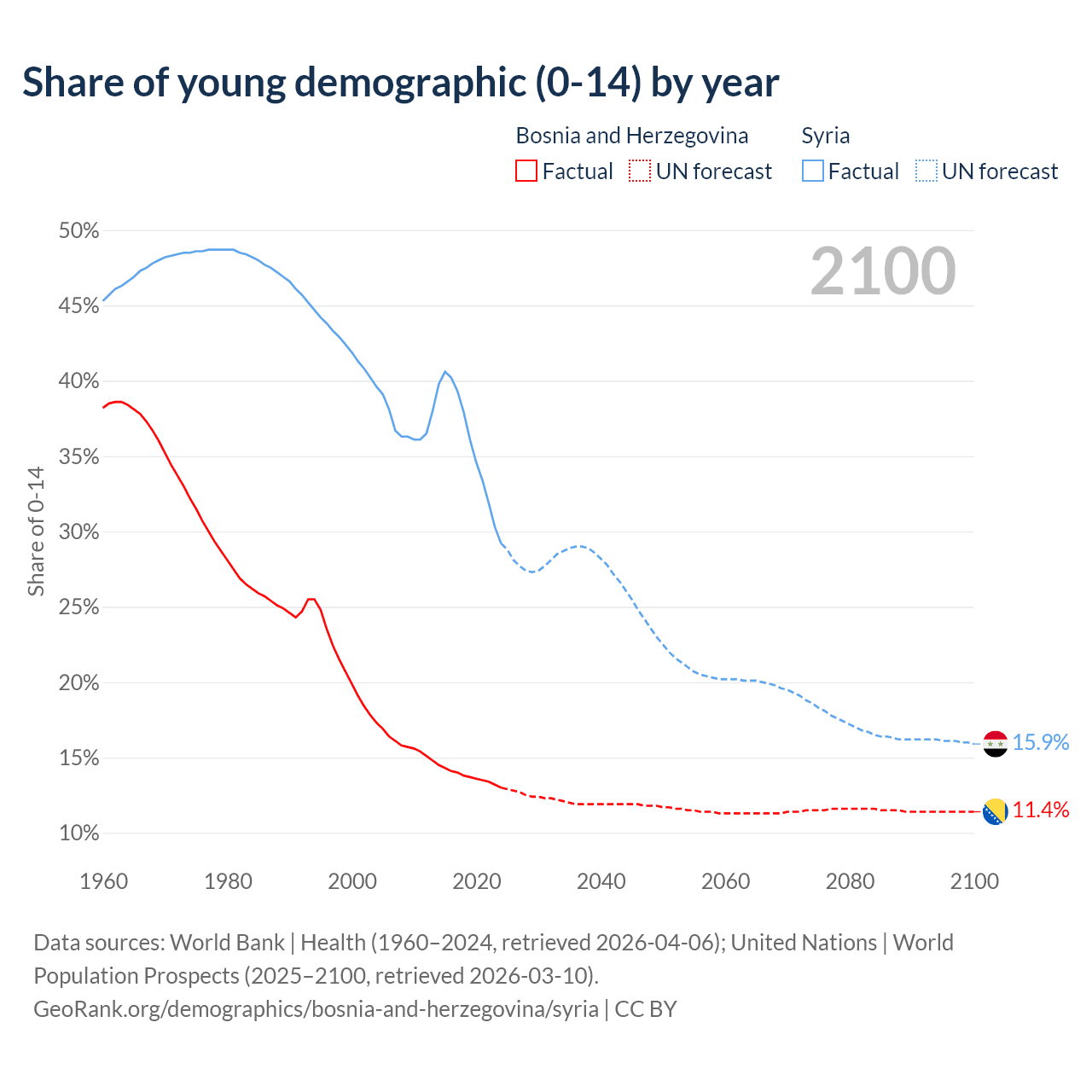 - The share of young demographic (0-15 years old) in Bosnia and Herzegovina is 13% vs 29.2% in Syria.