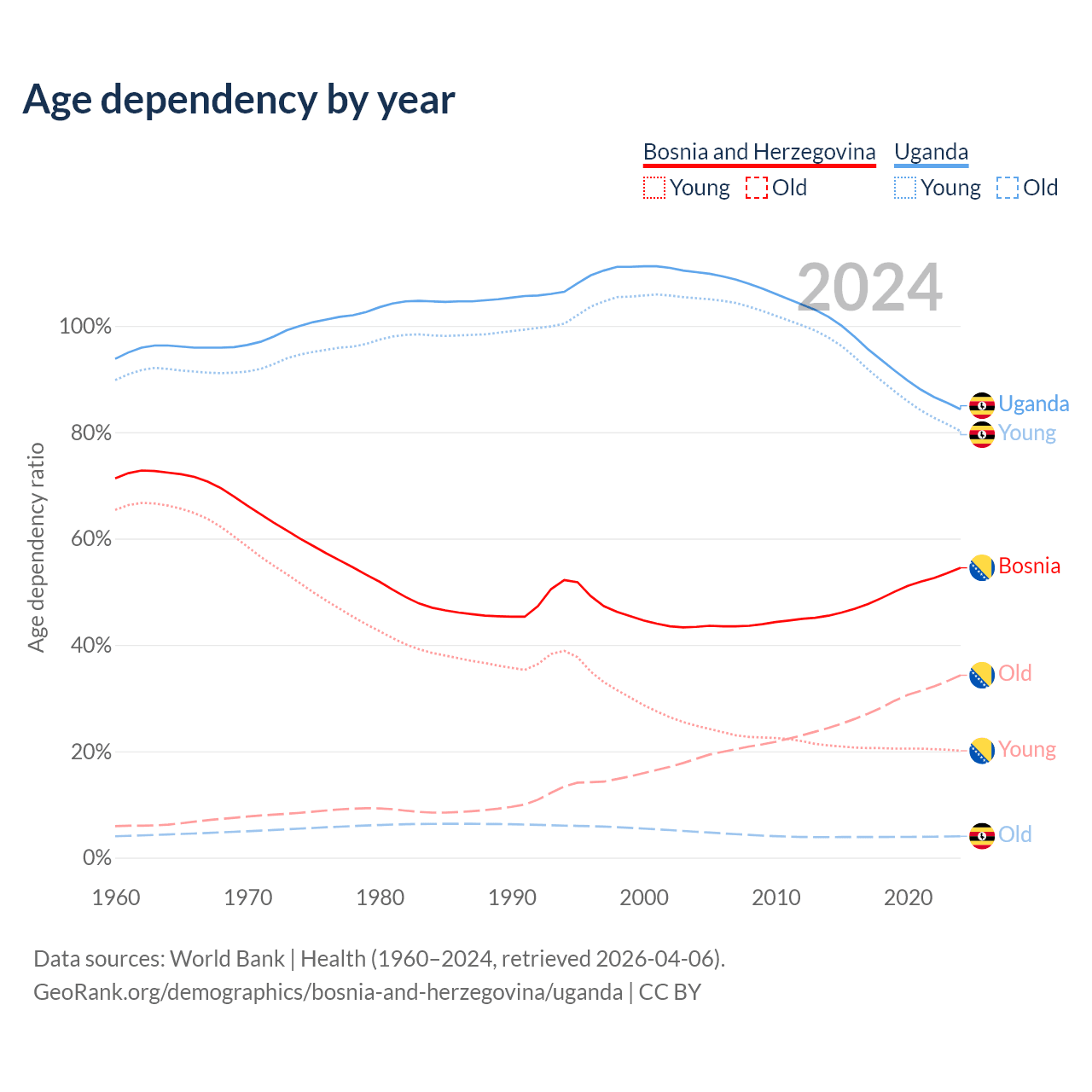 - Bosnia and Herzegovina is ranked 8/196 by median age (oldest to youngest) vs 187/196 for Uganda.